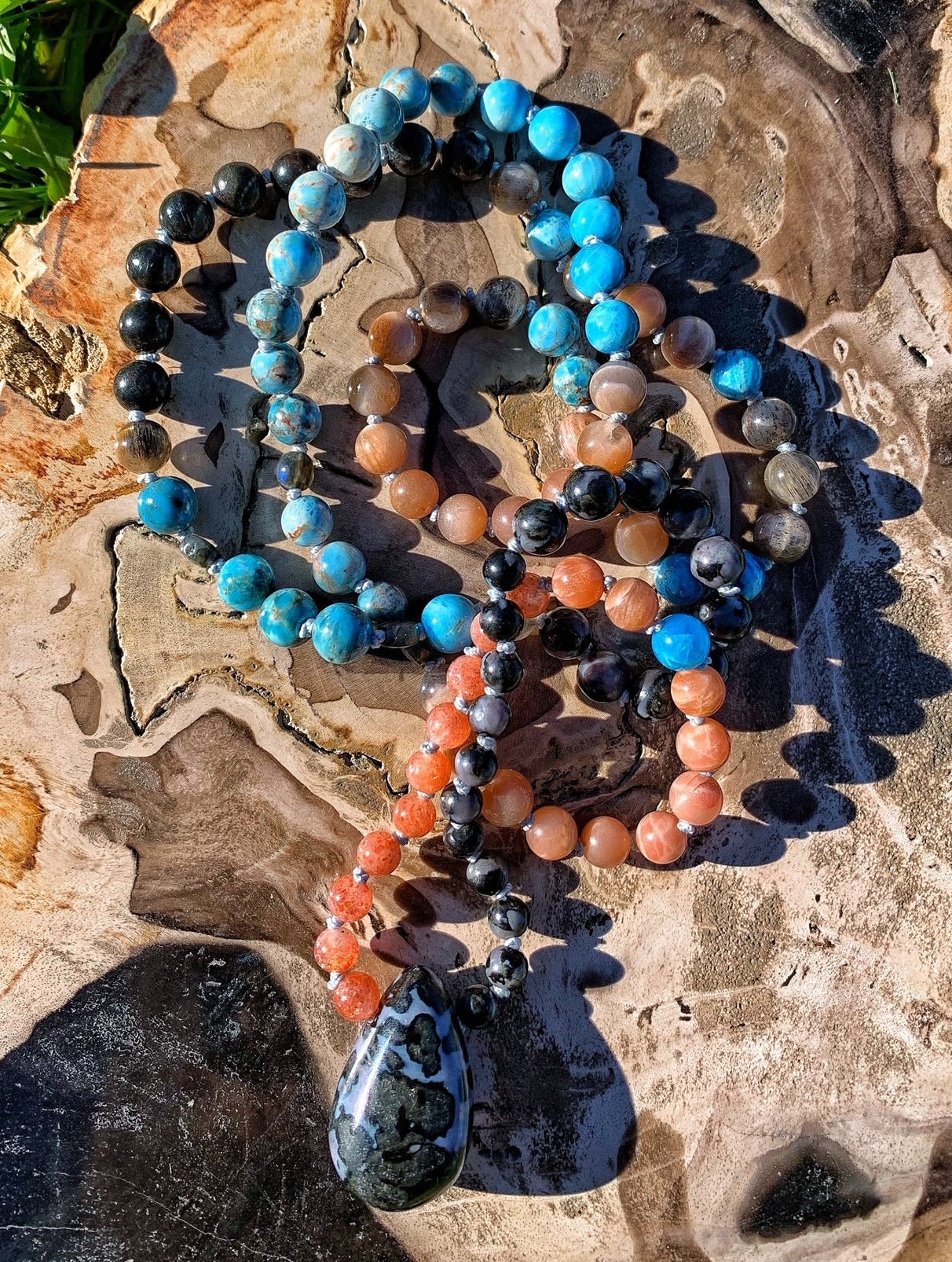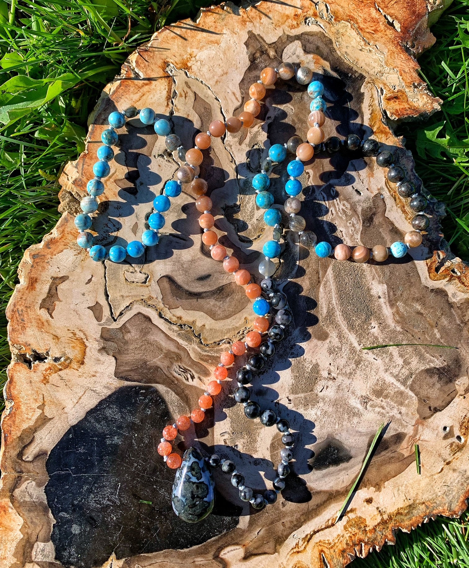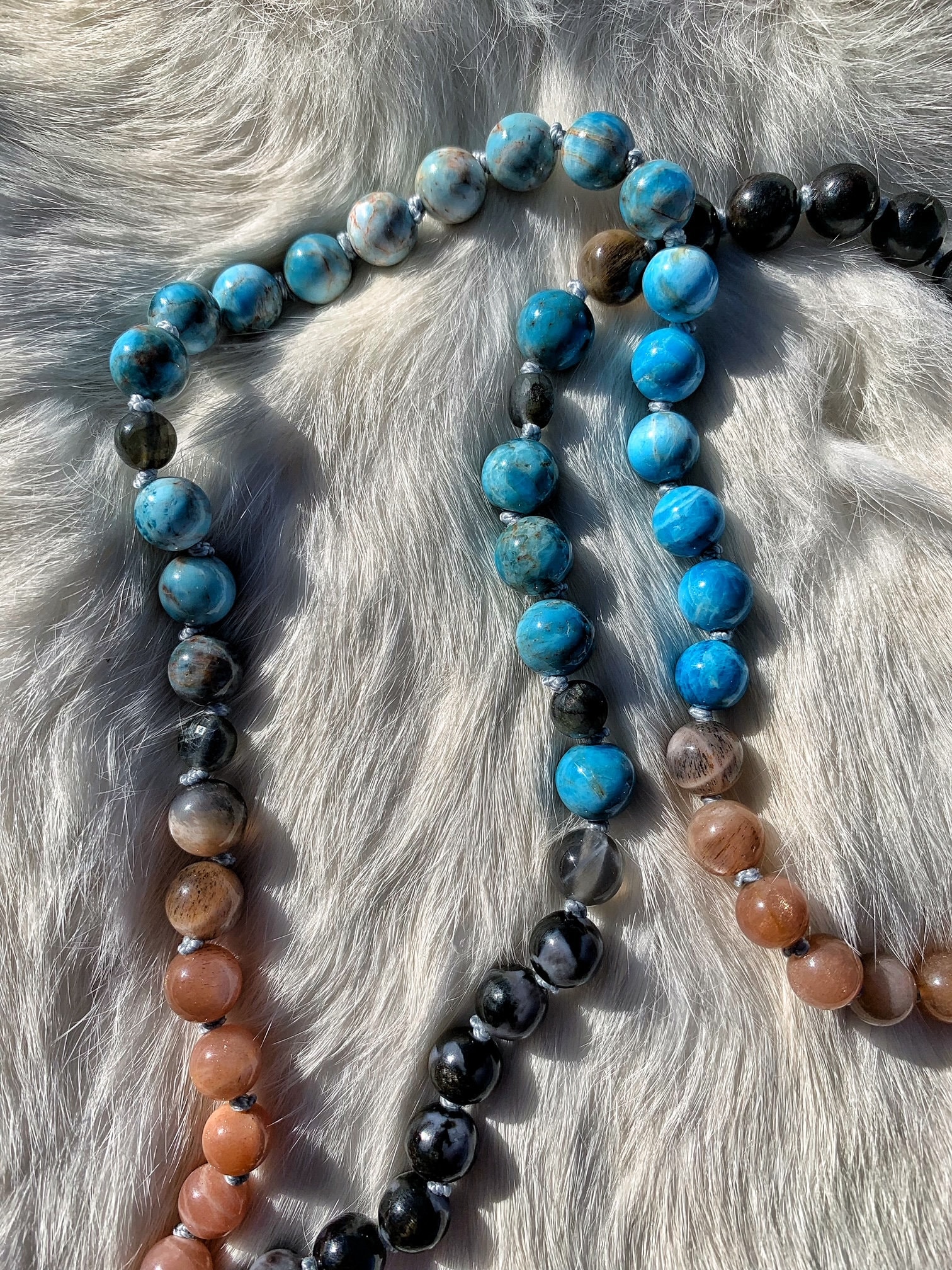 108 Top Quality Gemstone beads, Crystals and Stones in this necklace/bracelet are; Blue Apatite, Peach Moonstone, Sunstone, Labradorite, Arvfedsonite, Indigo Gabbro, Black & Grey Moonstone with Rutile inclusions, plus one Indigo Gabbro Pendant.