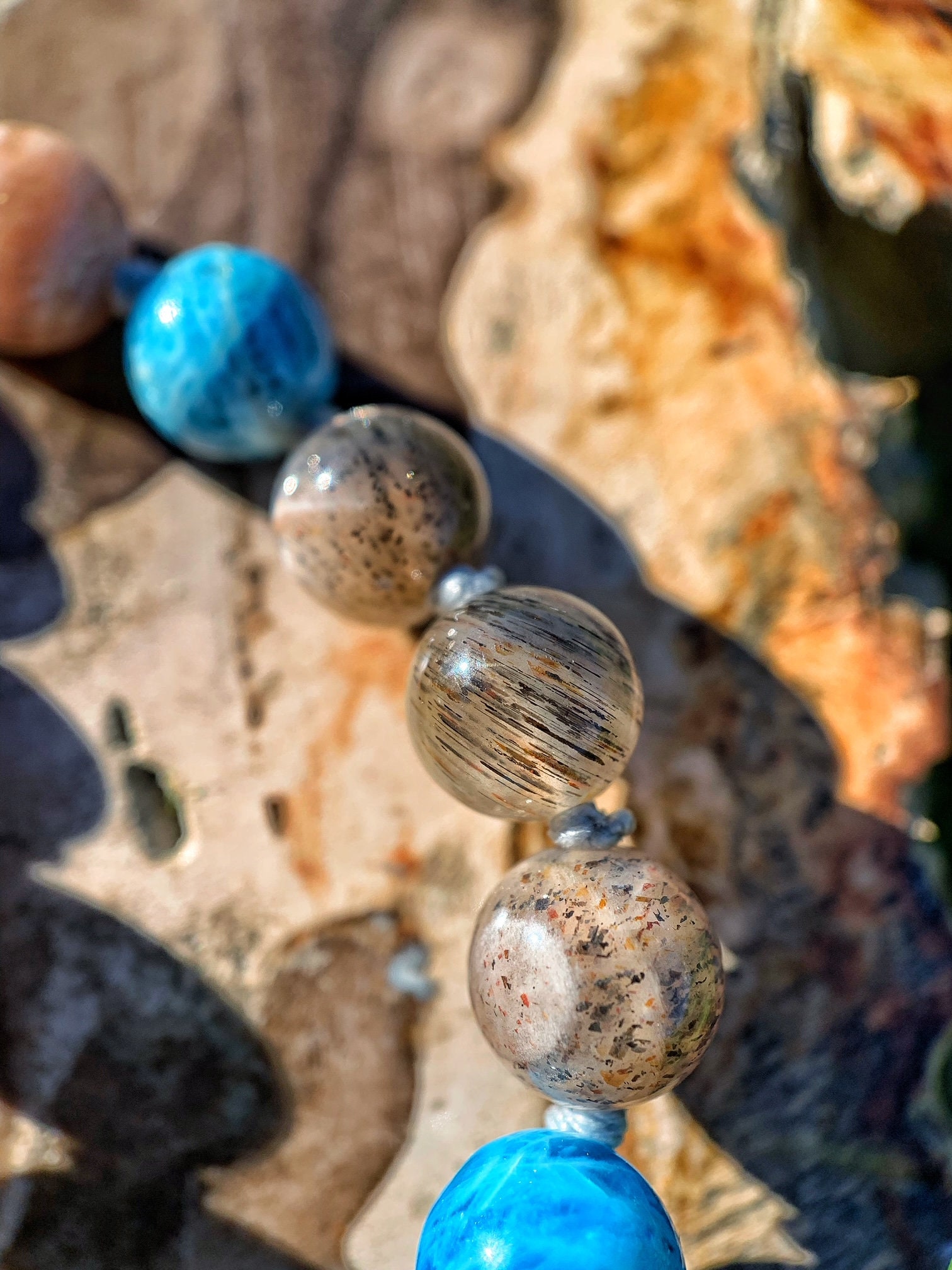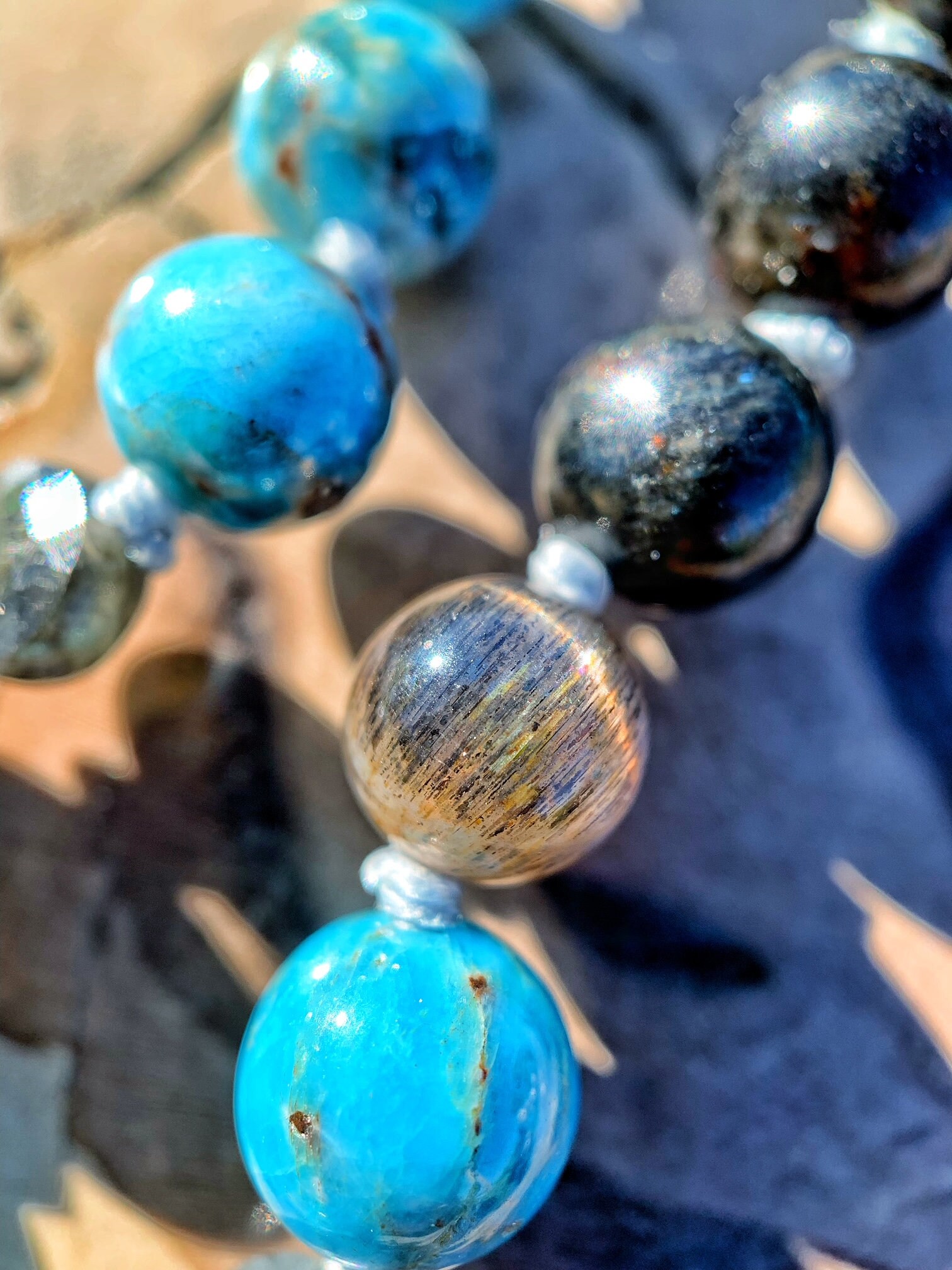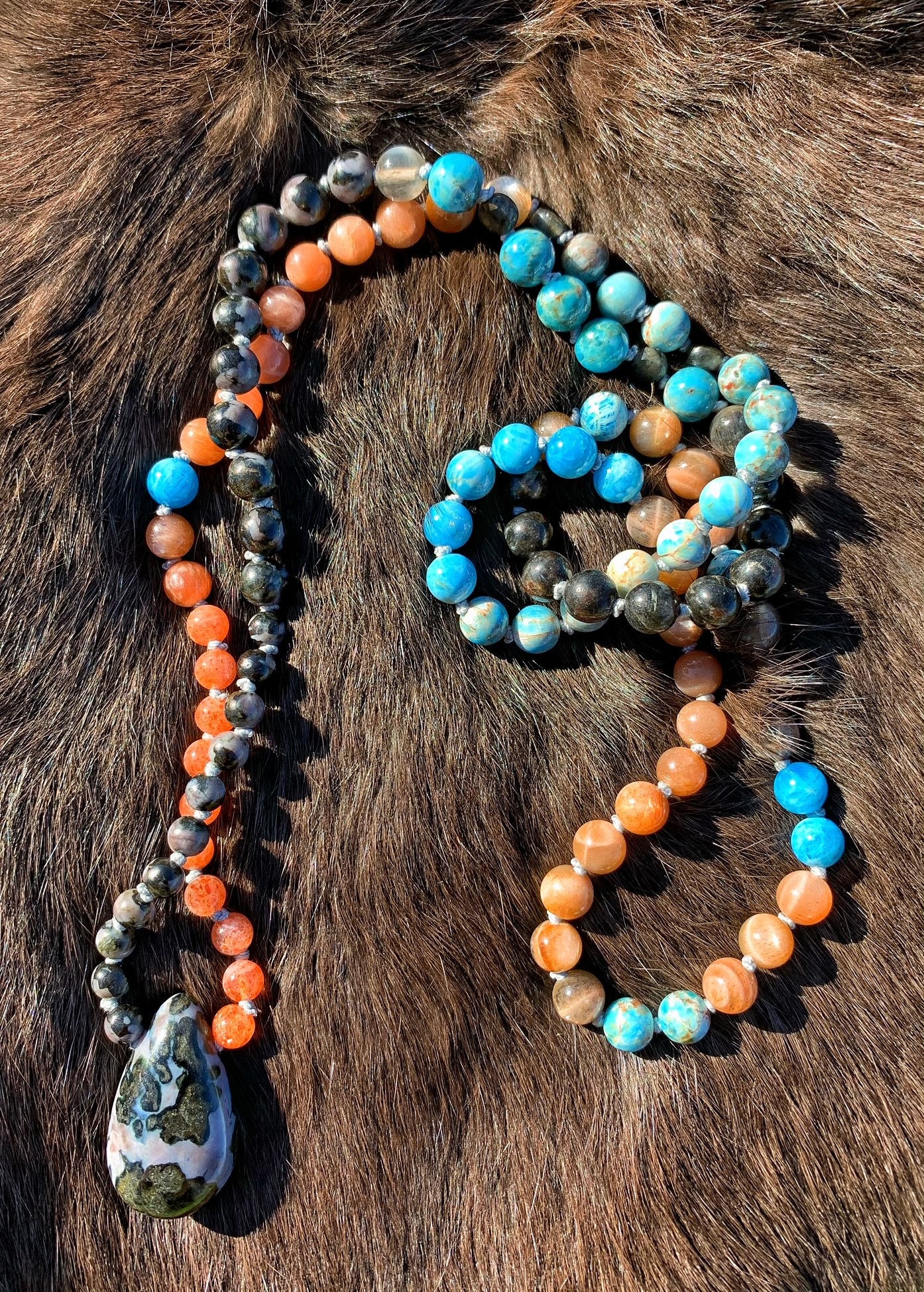 108 Top Quality Gemstone beads, Crystals and Stones in this necklace/bracelet are; Blue Apatite, Peach Moonstone, Sunstone, Labradorite, Arvfedsonite, Indigo Gabbro, Black & Grey Moonstone with Rutile inclusions, plus one Indigo Gabbro Pendant.