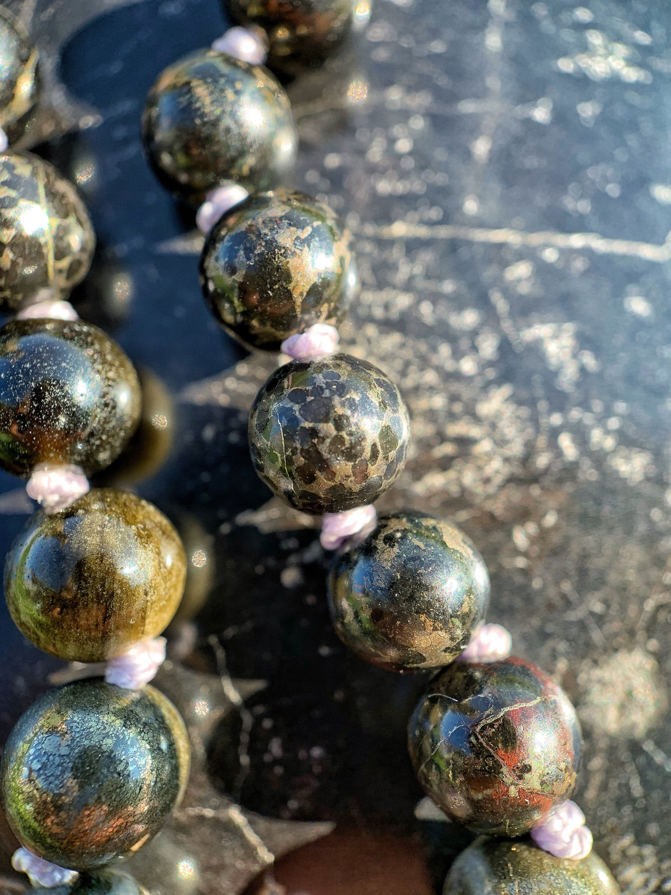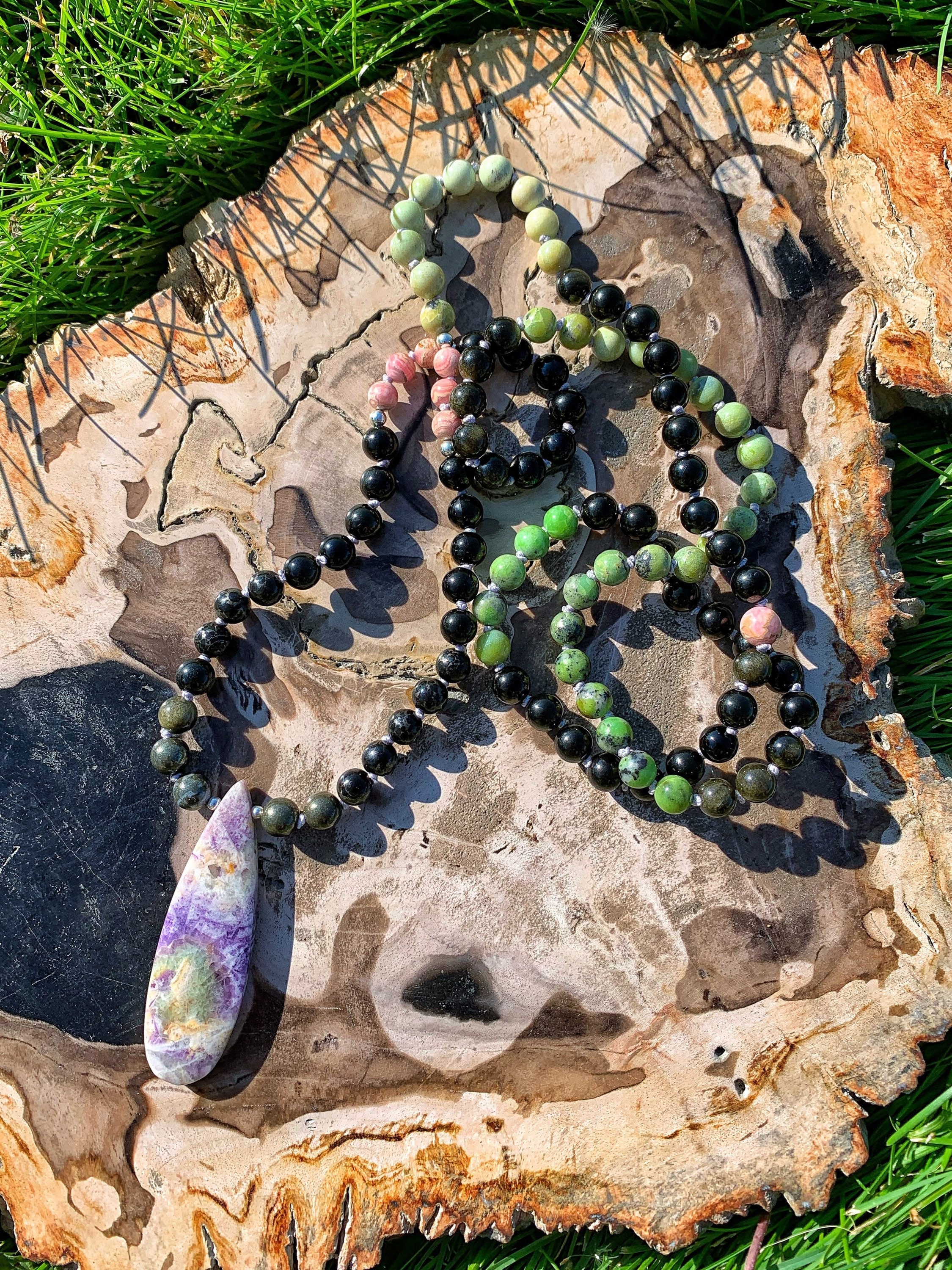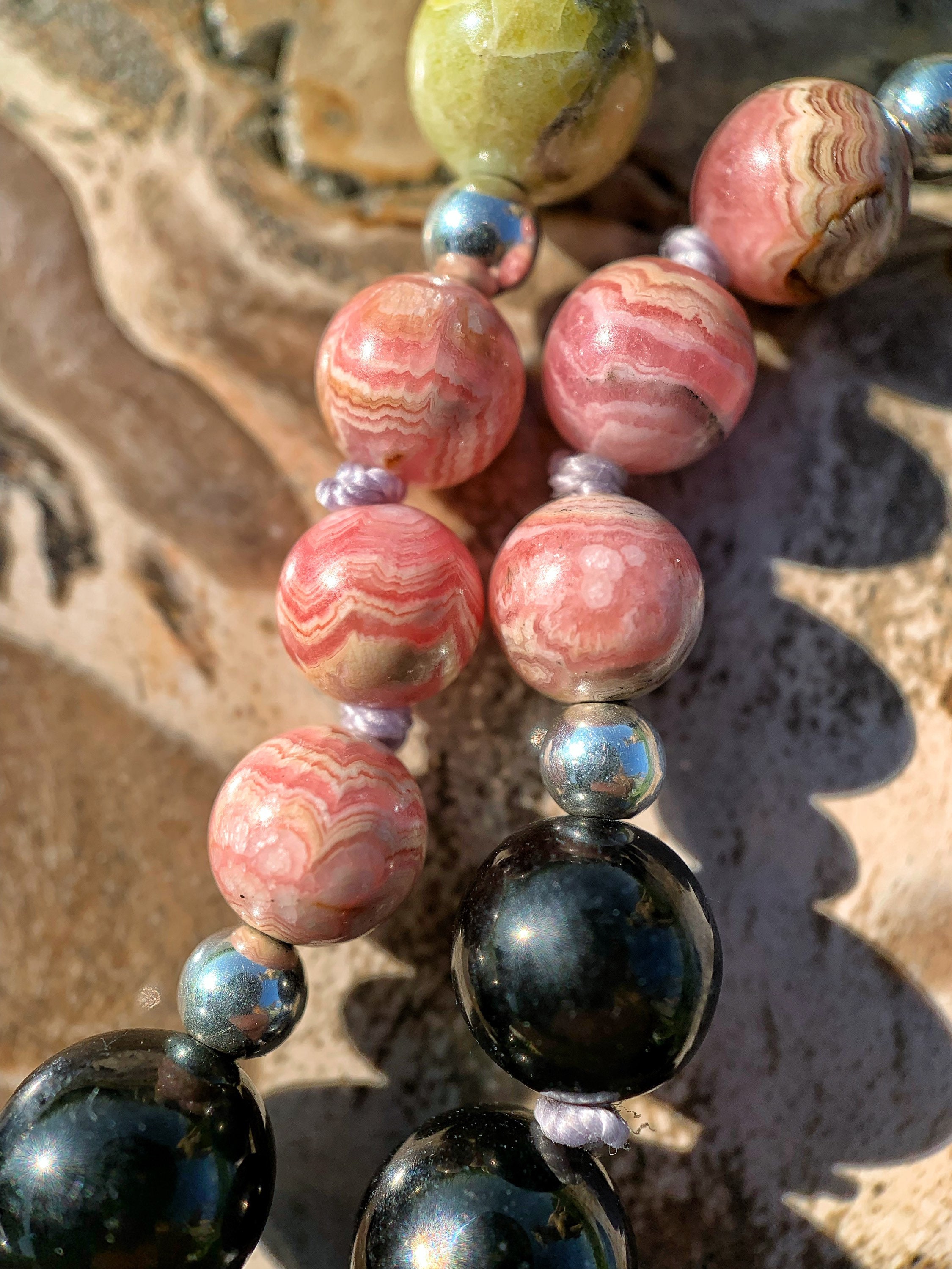 108 Top Quality Gemstone beads, Crystals and Stones in this necklace/bracelet are; Chrysoprase, Rhodochrosite, Golden Obsidian, Black Jade with Pyrite inclusions, 925k Sterling Silver, Jet, Pyrite with Quartz inclusions, and one Amaranthine pendant.