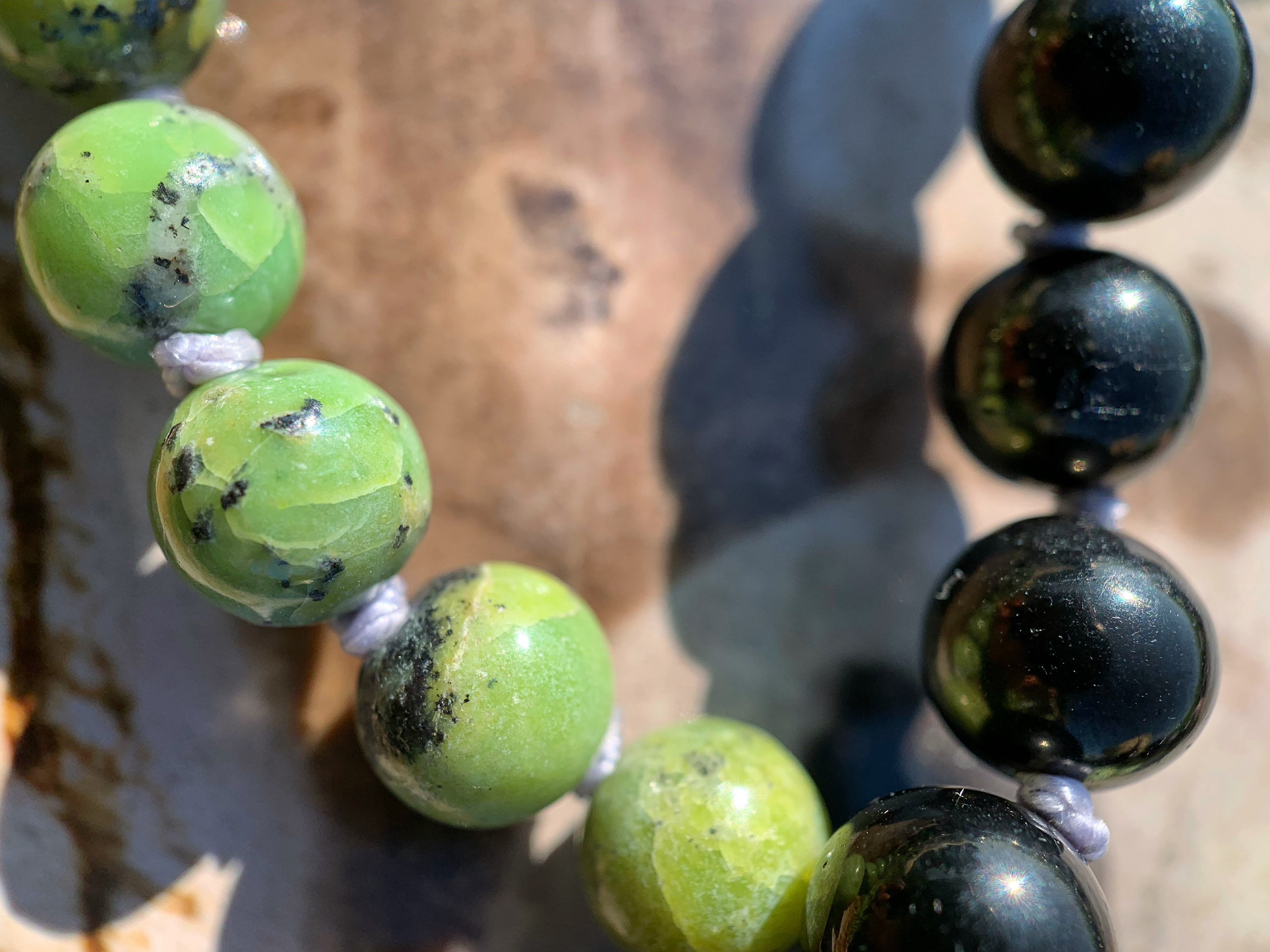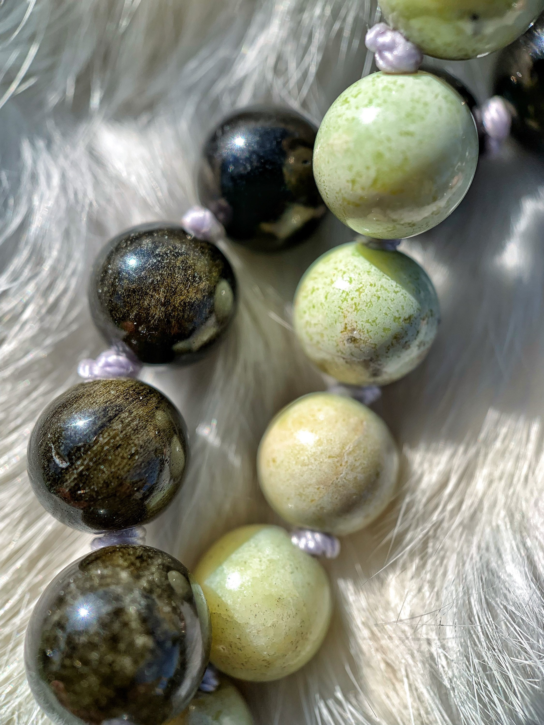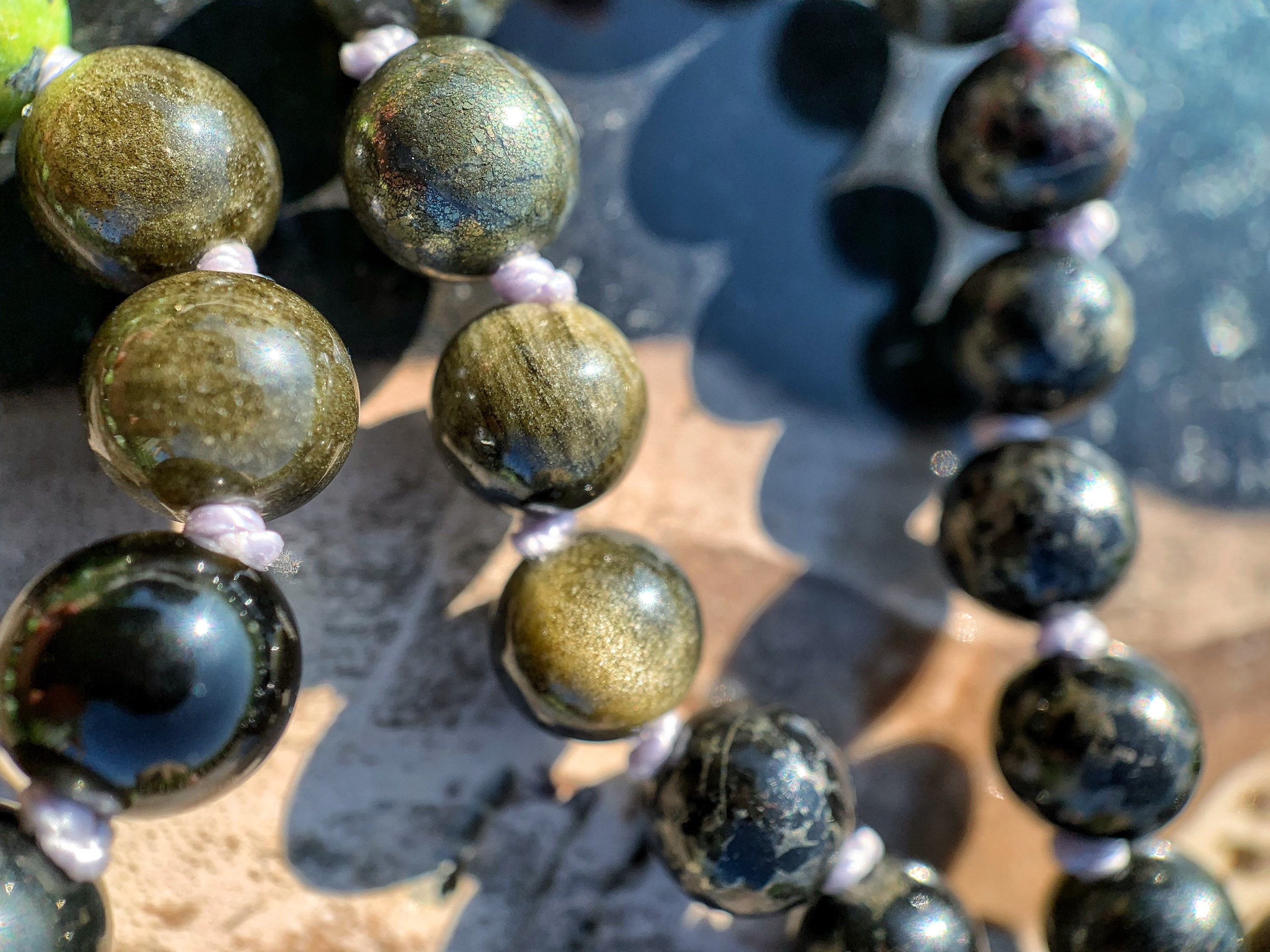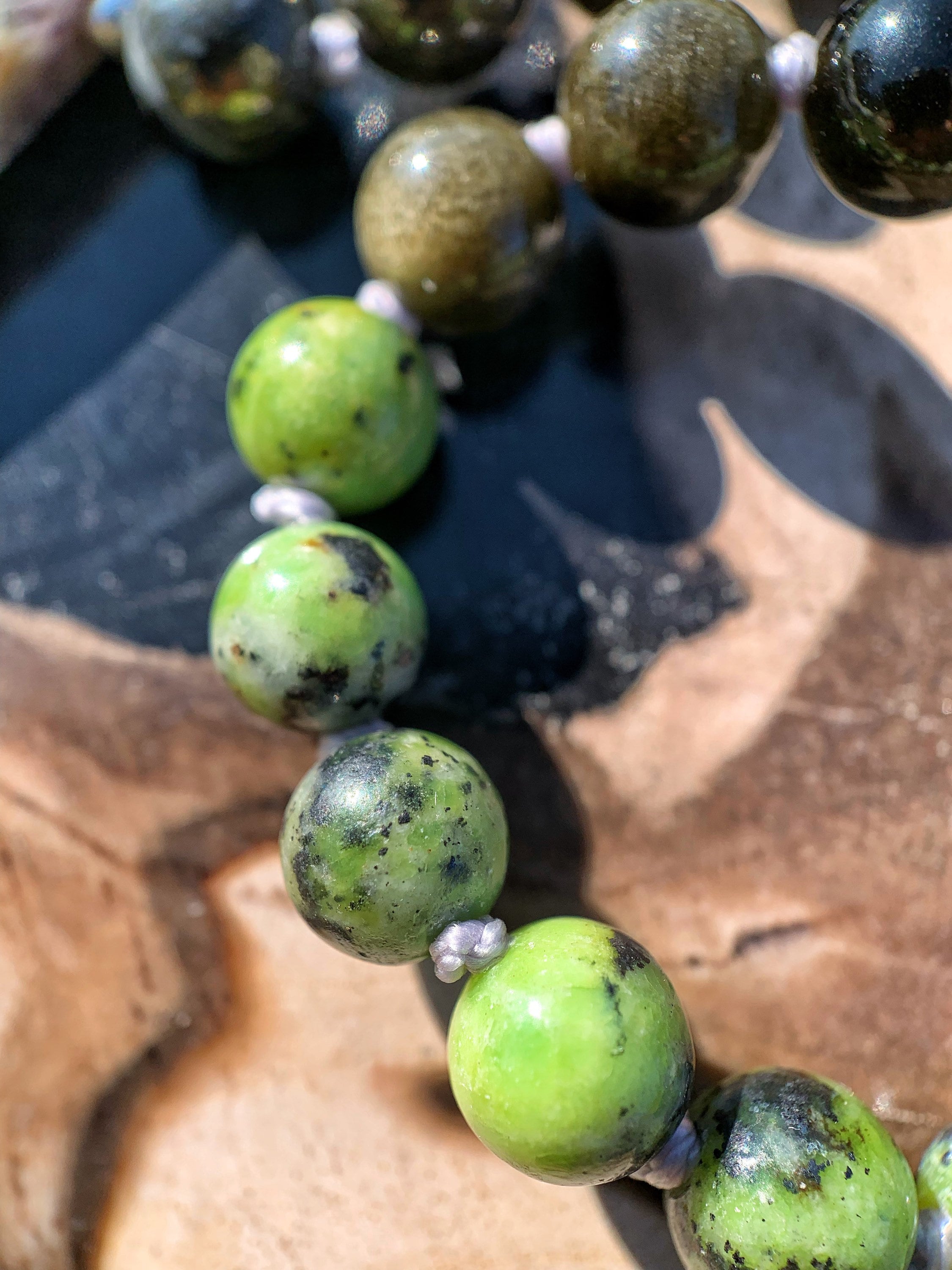 108 Top Quality Gemstone beads, Crystals and Stones in this necklace/bracelet are; Chrysoprase, Rhodochrosite, Golden Obsidian, Black Jade with Pyrite inclusions, 925k Sterling Silver, Jet, Pyrite with Quartz inclusions, and one Amaranthine pendant.