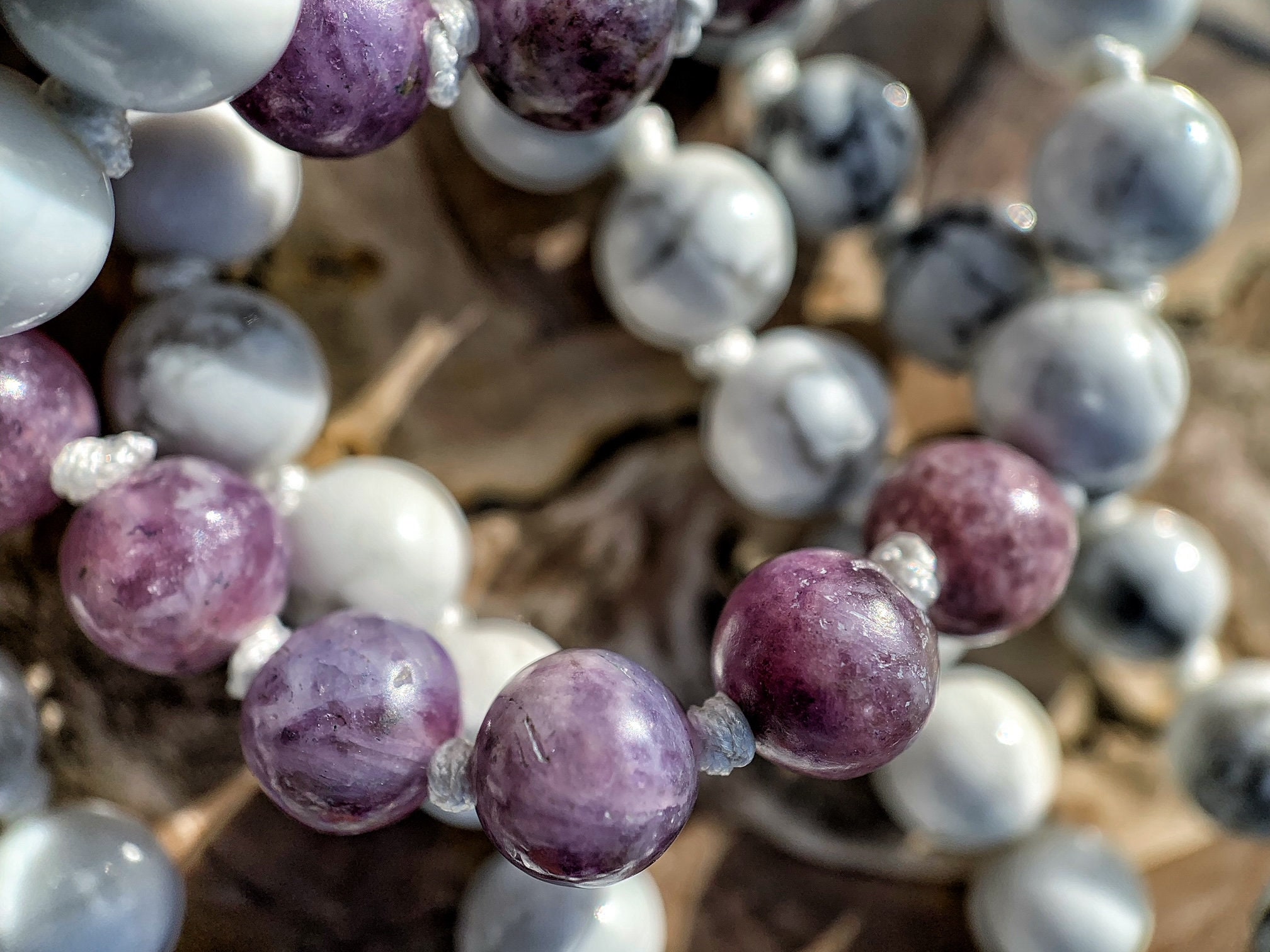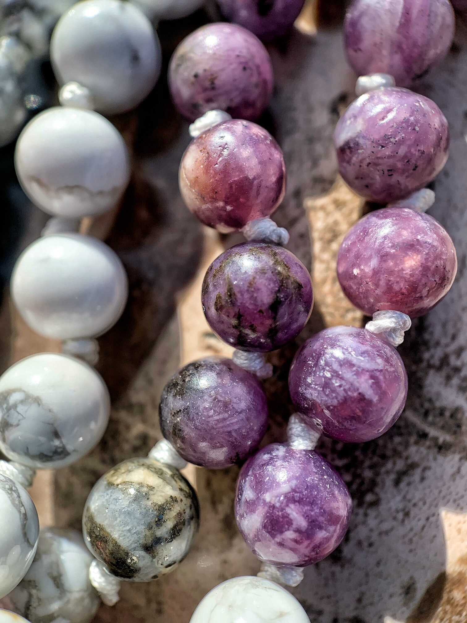 108 Top Quality Gemstone beads, Crystals and Stones in this necklace/bracelet are; Howlite, Purple Lepidolite, Quartz with Pyrite inclusions, One Frosted Engraved Quartz Guru Bead, One Rudraksha Guru Bead and a handmade tassel.