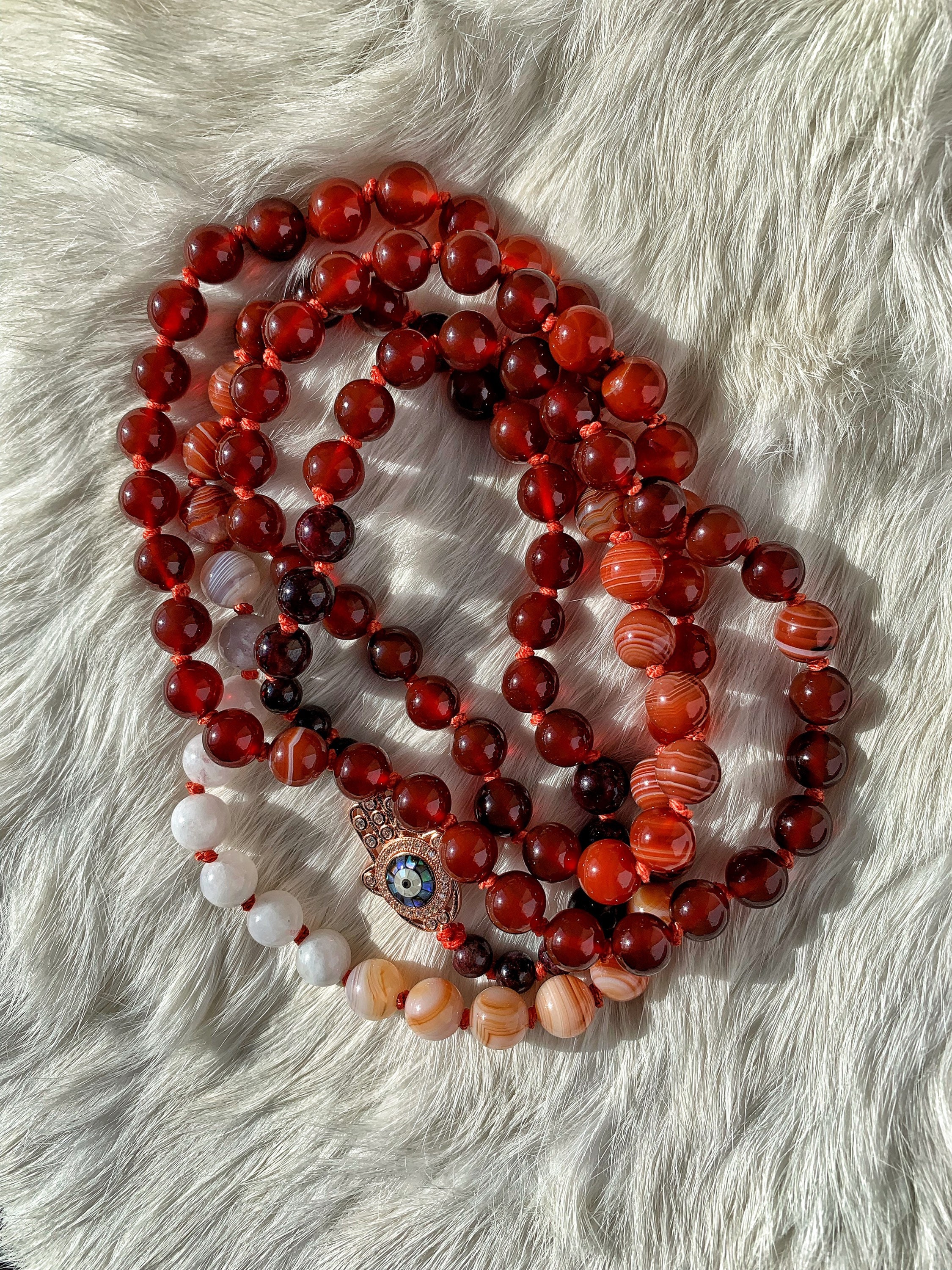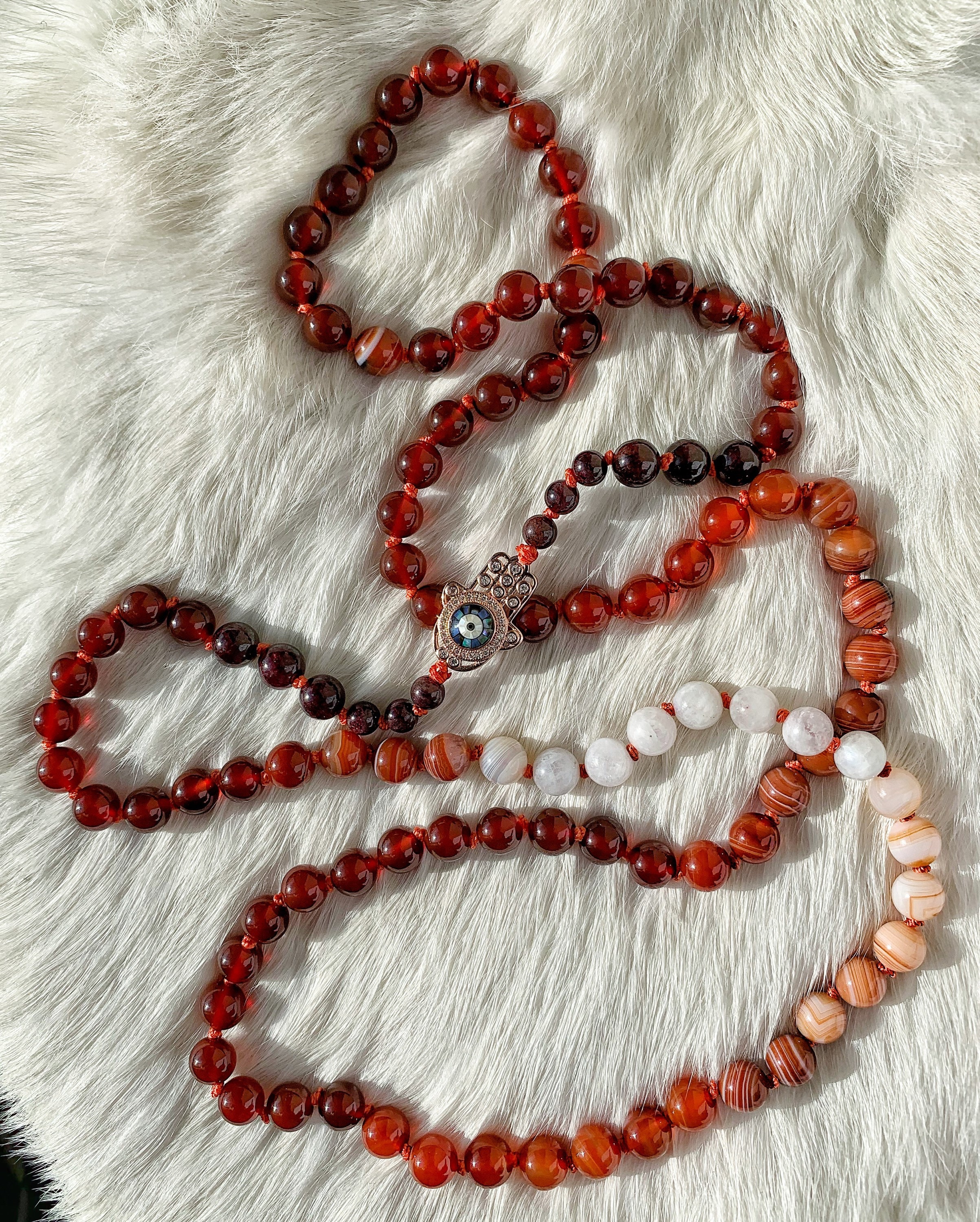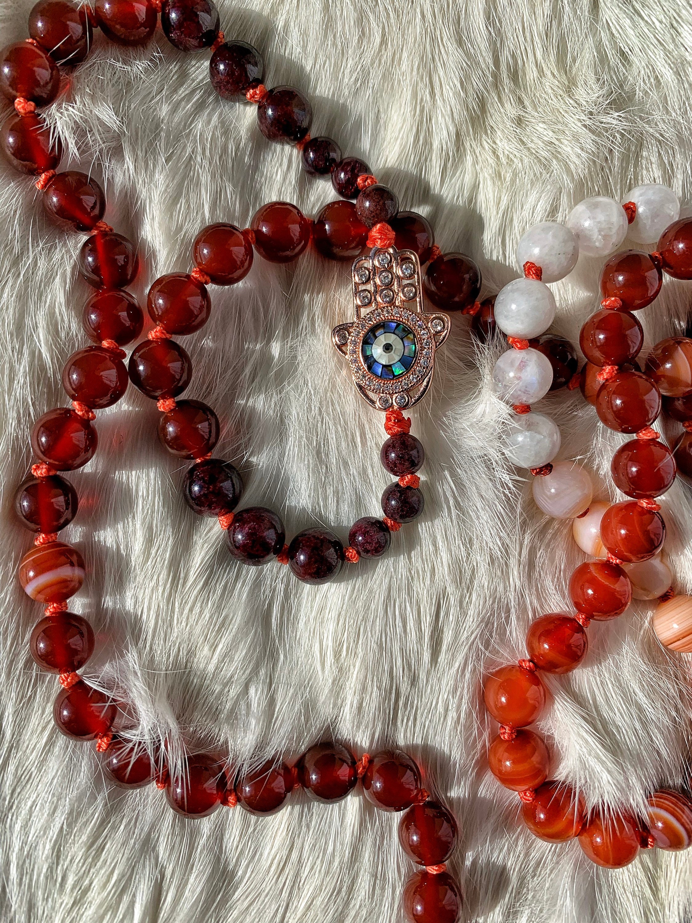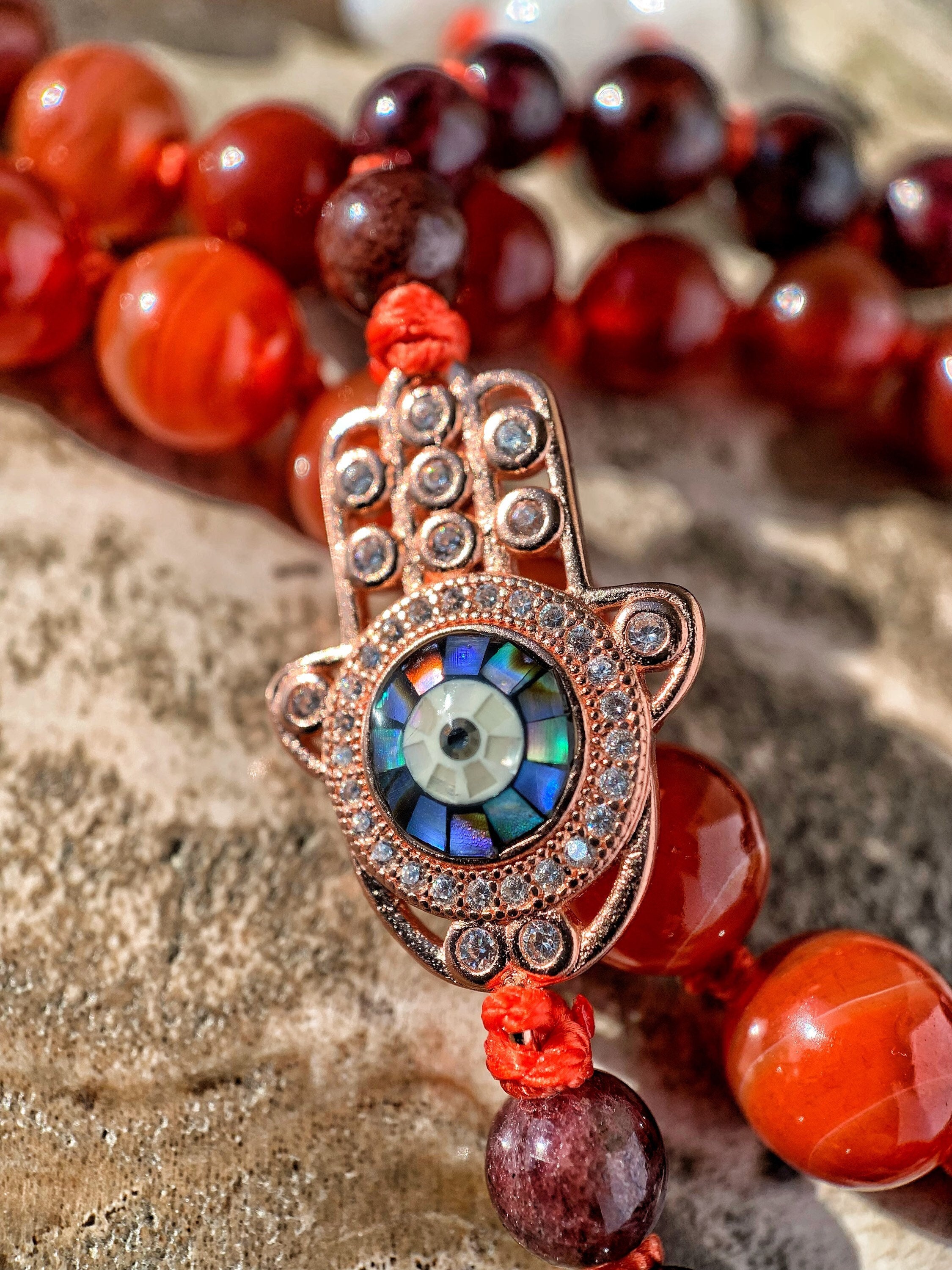 111 Top Quality Gemstone beads, Crystals and Stones in this necklace/bracelet are; Carnelian, Banded Agate, Garnet, White Moonstone, Rainbow Moonstone, One 18k Rose Gold Plated Shell HAMSA Gemstone Connector.