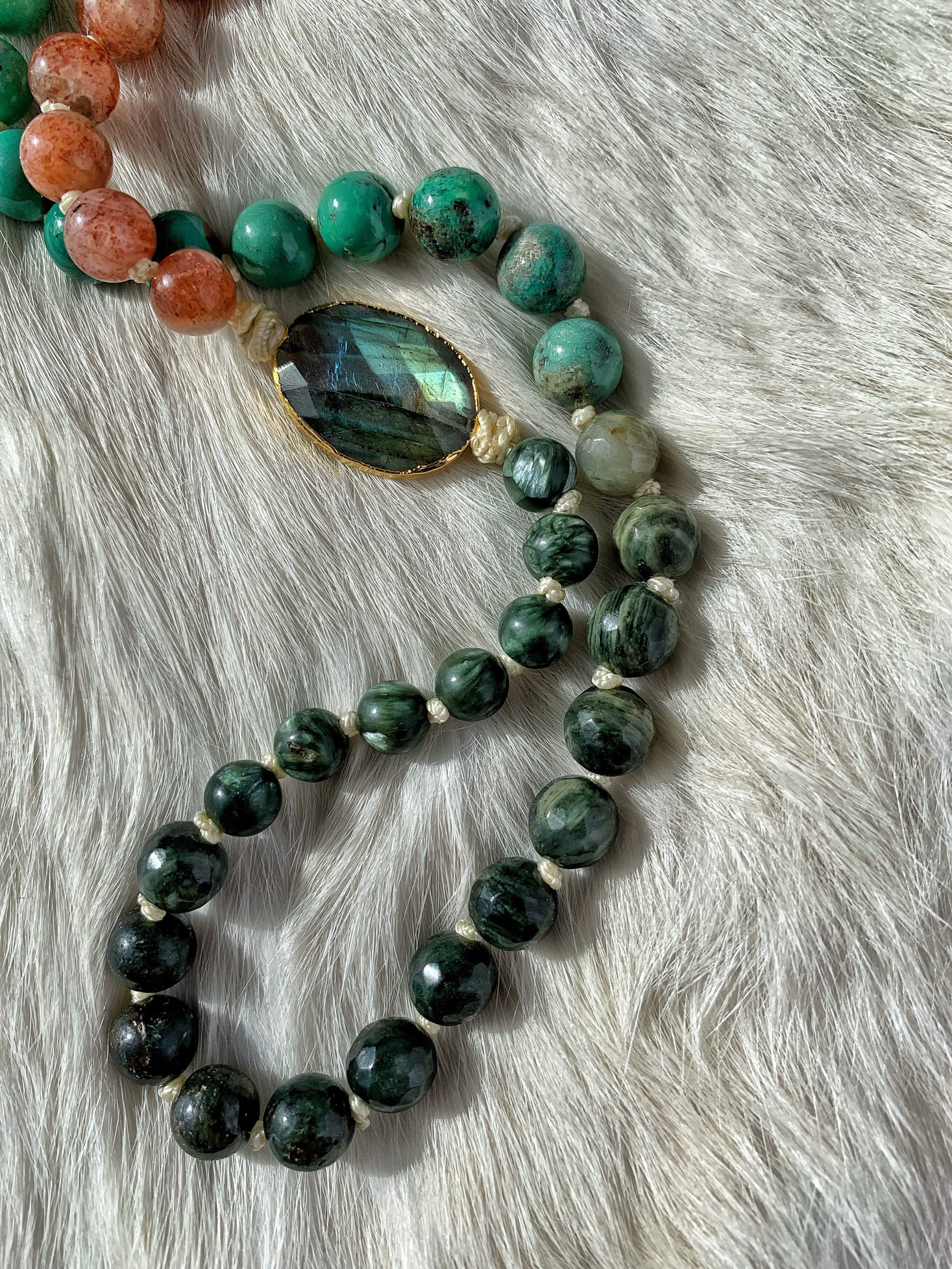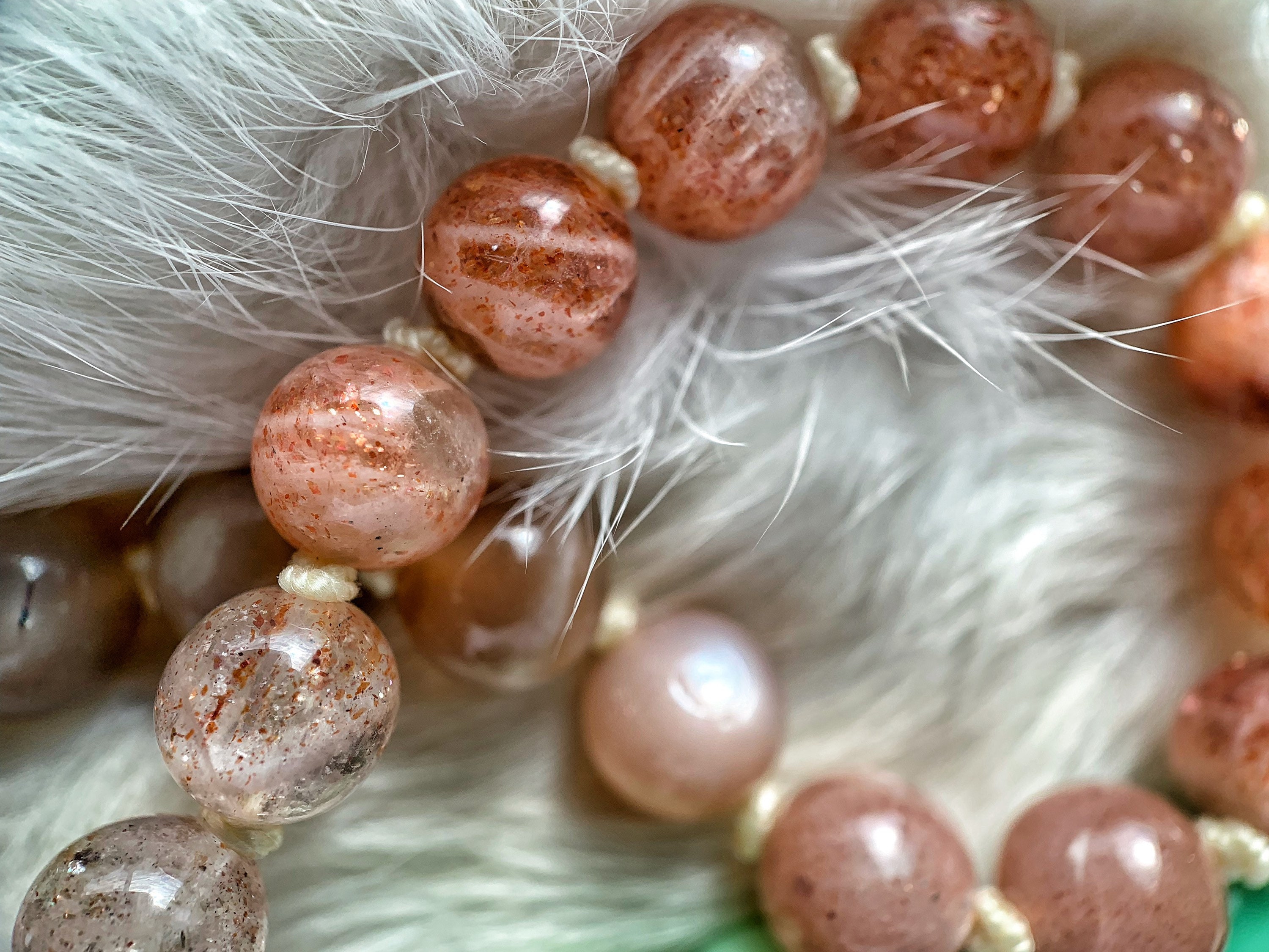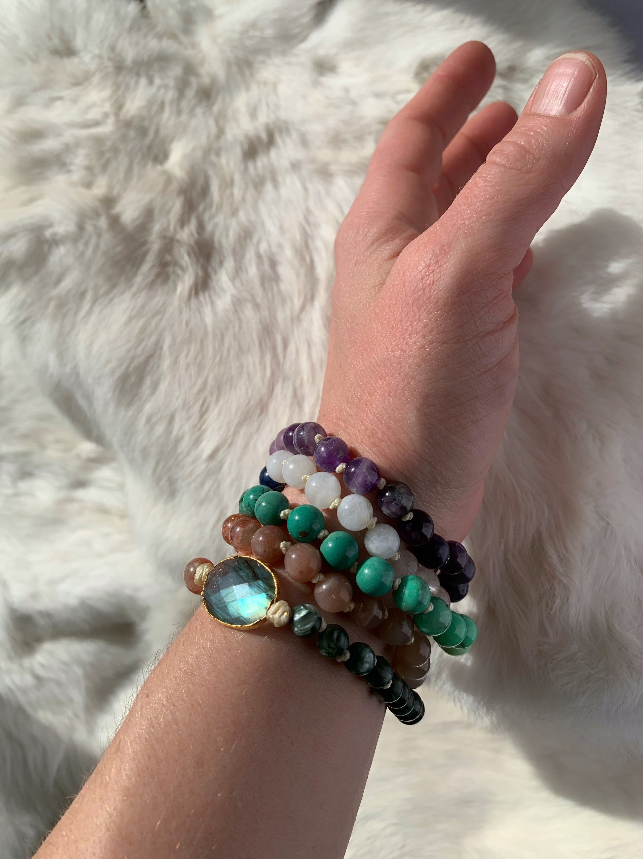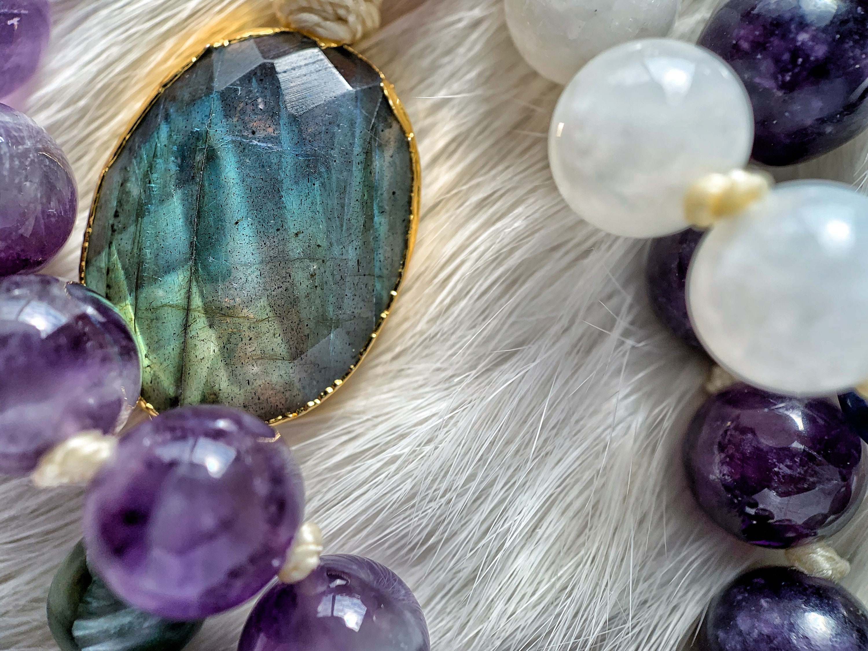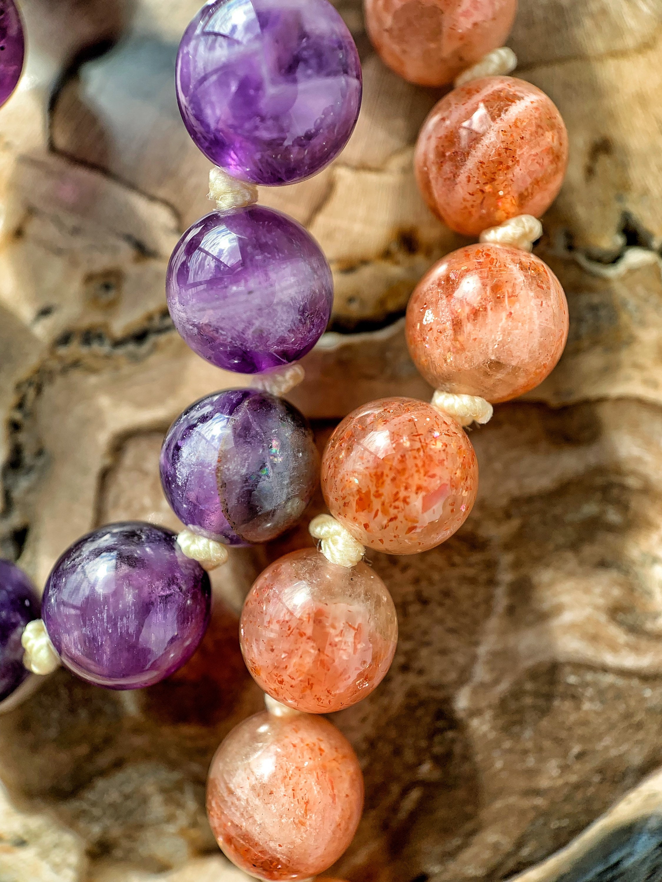 108 Top Quality Gemstone beads, Crystals and Stones in this necklace/bracelet are; Amethyst, Dogtooth Amethyst, Green Line Quartz, Sunstone, Peach Moonstone, White Moonstone, Grey Moonstone, Serafina, Purple Lepidolite, Green Moss Opal, Astrophyllite, Strawberry Lepidocrocite, Dumortierite, and one 22k Gold Electroplated Labradorite Gemstone Connector.