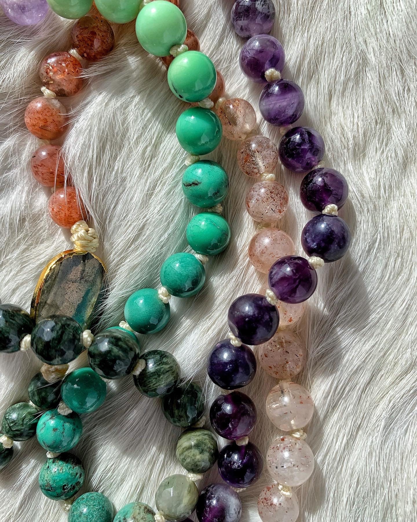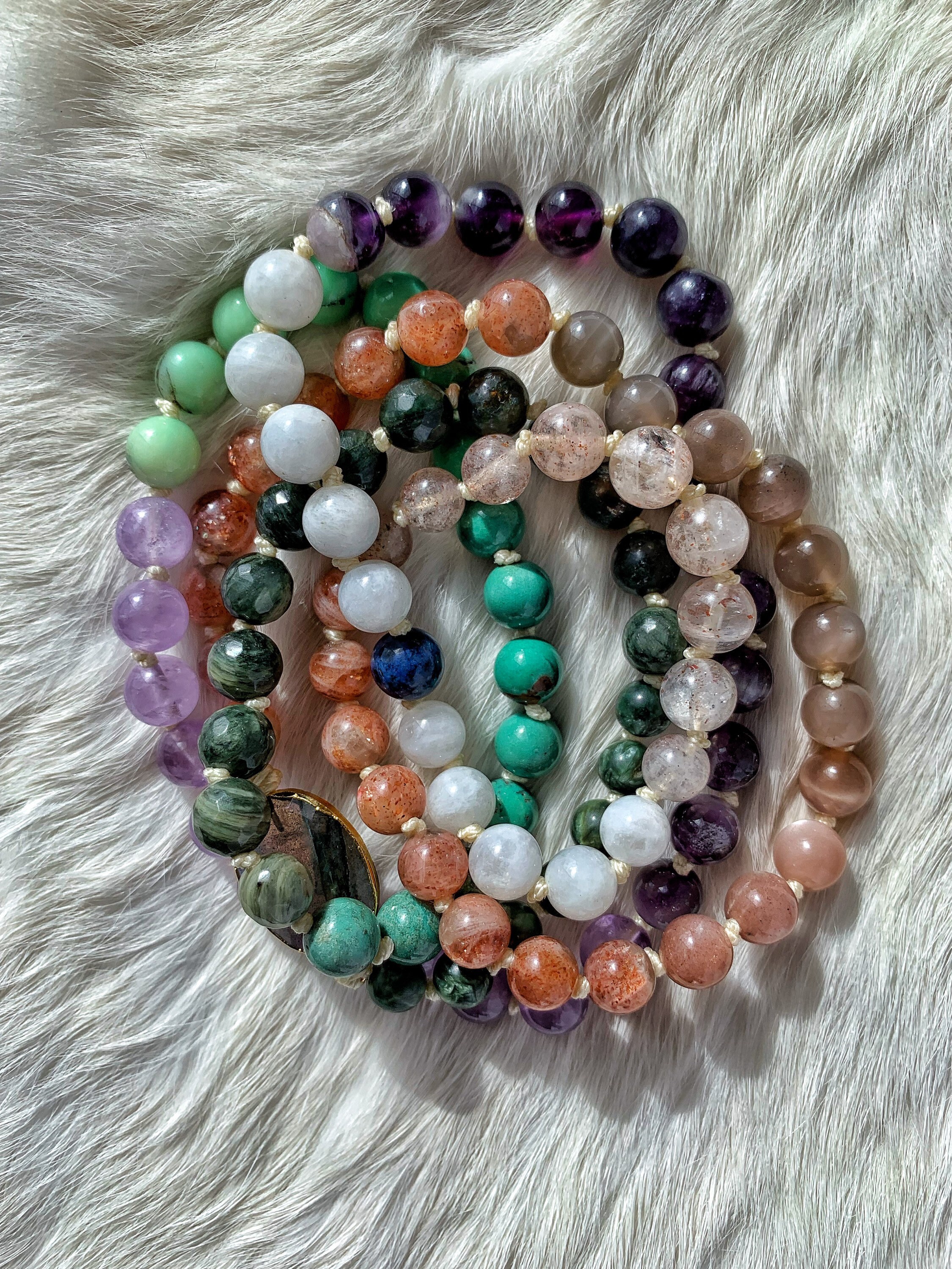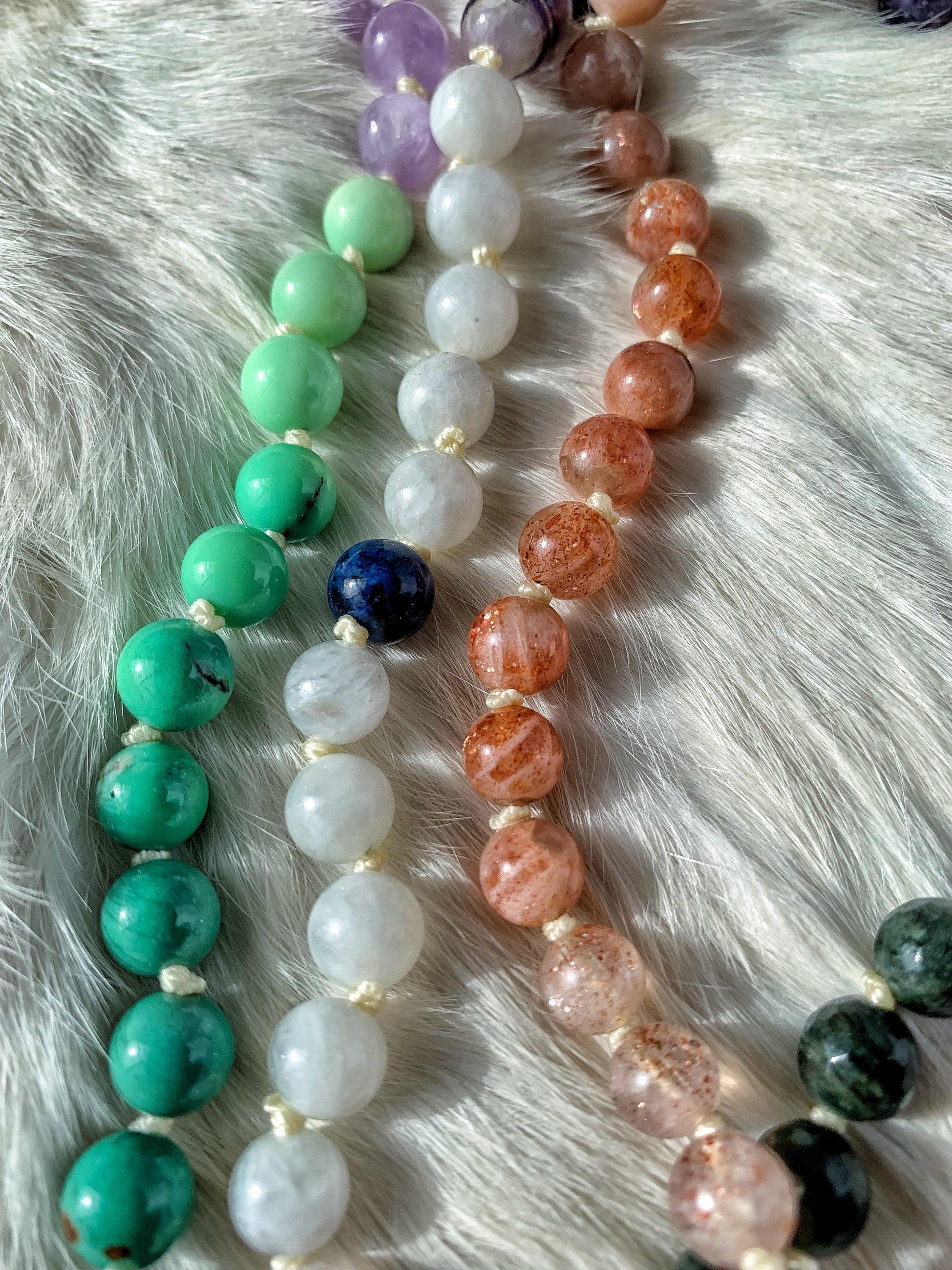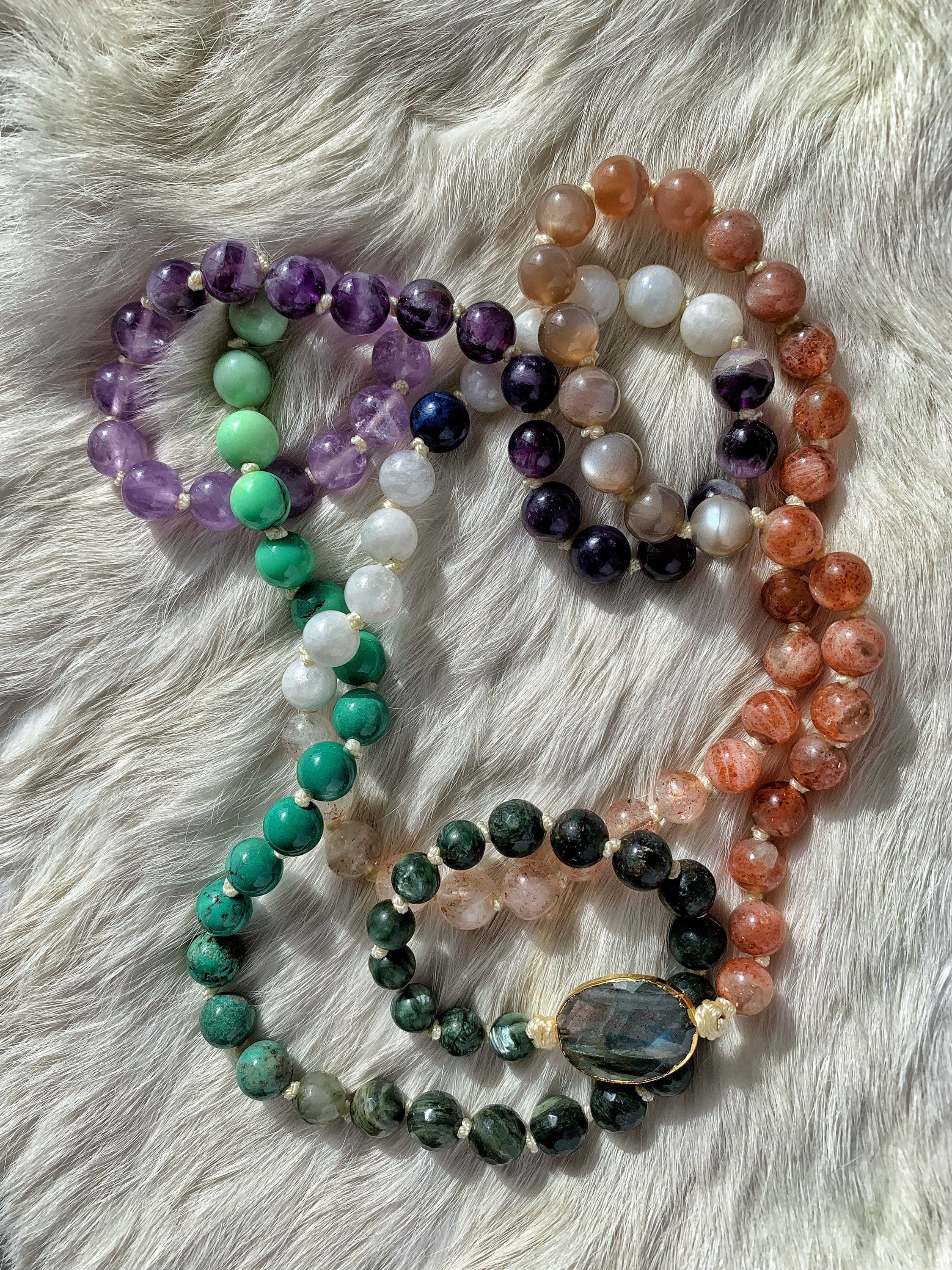The Prayer Mala can be worn as a necklace or wrapped around the wrist as a bracelet. All Gems, Crystals and Stones are cleansed energetically, blessed and carefully hand selected and knotted for each Mala - no two are alike.