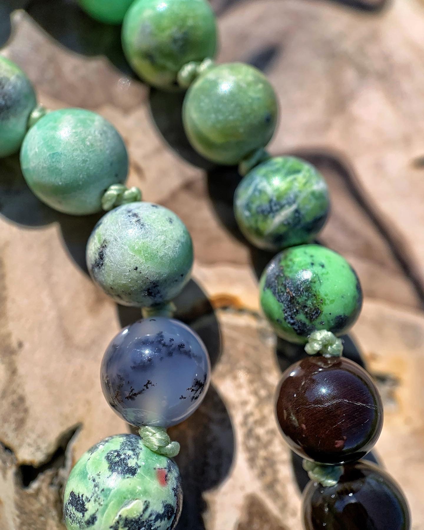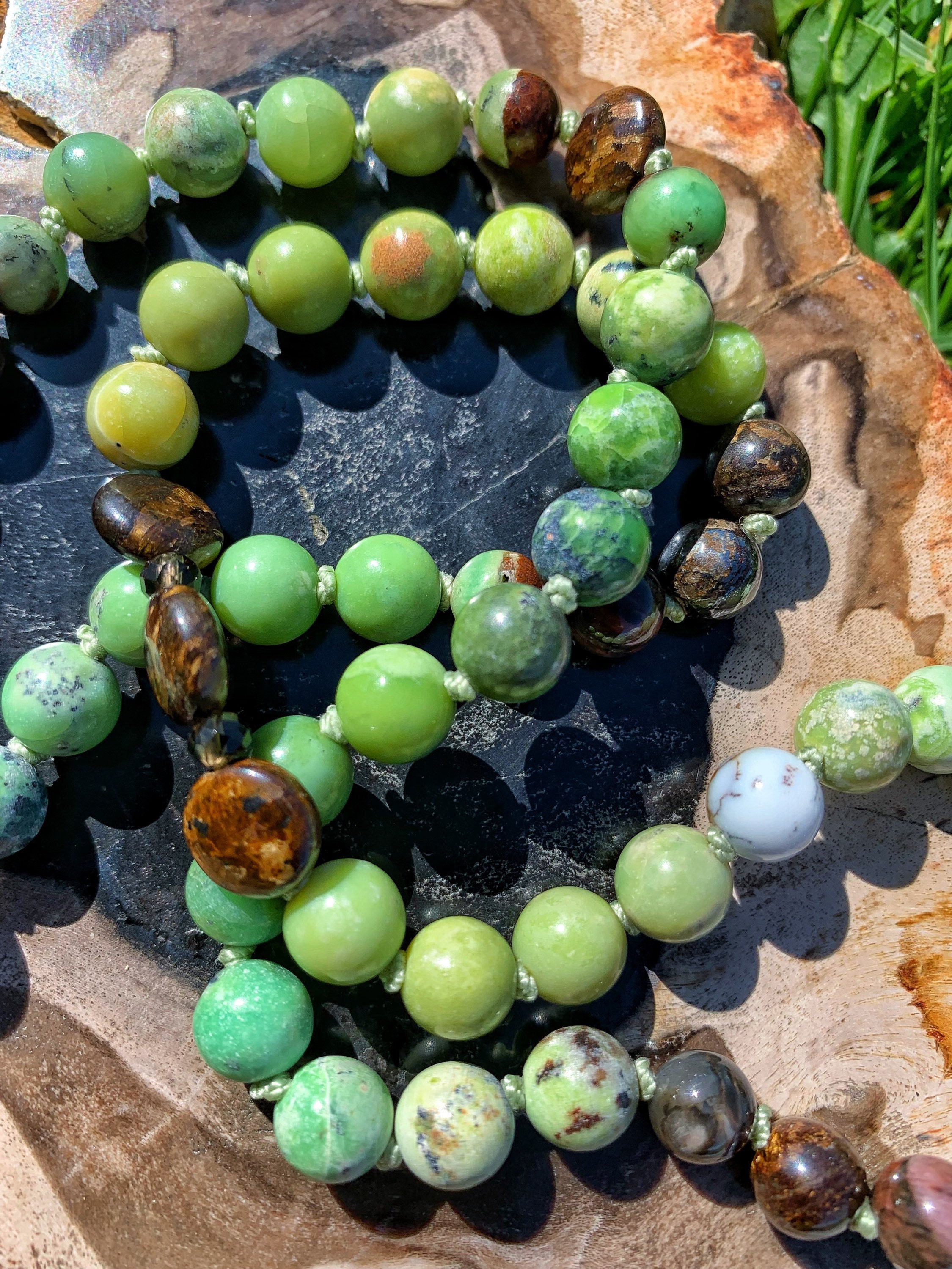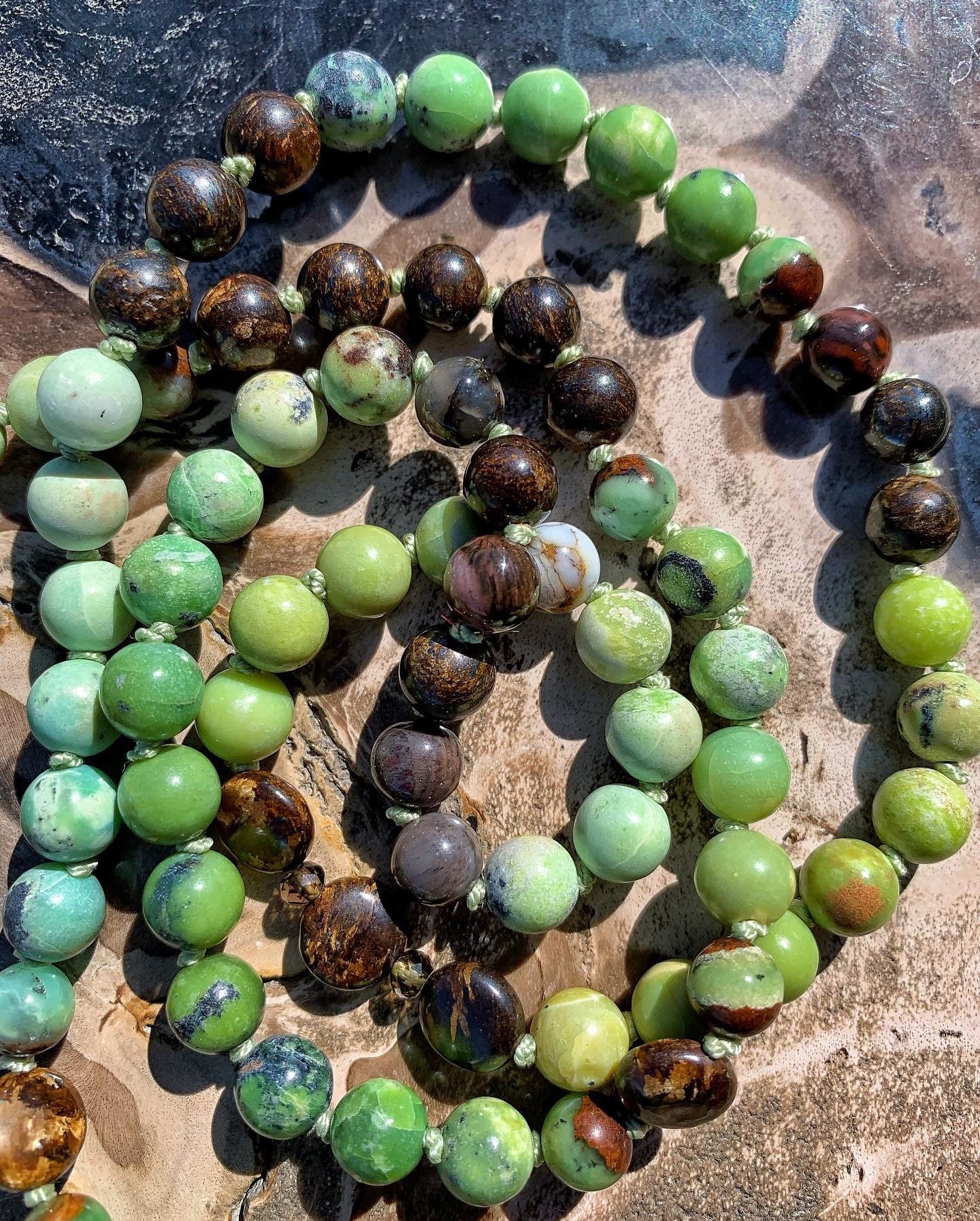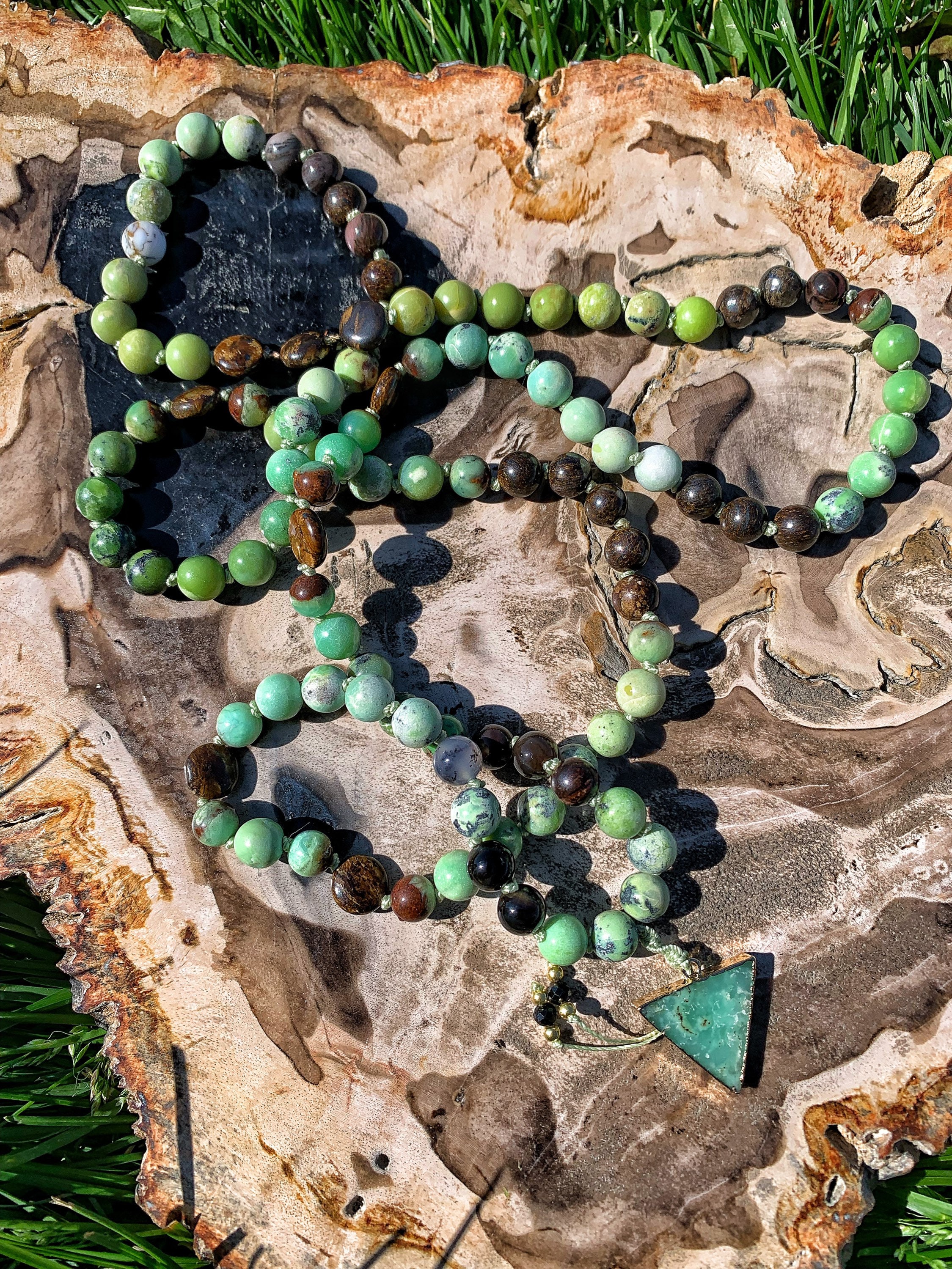 108 Top Quality Gemstone beads, Crystals and Stones in this necklace/bracelet are; Chrysoprase, Bronzite, Merlinite, Dendritic Agate, Smokey Quartz, Petrified Wood, Petrified Bog, Chalcedony and Opalized Nature. Finished with an electroplated 24k Gold Chrysoprase Pendant, 14k Gold Filled Beads and Black Spinel.