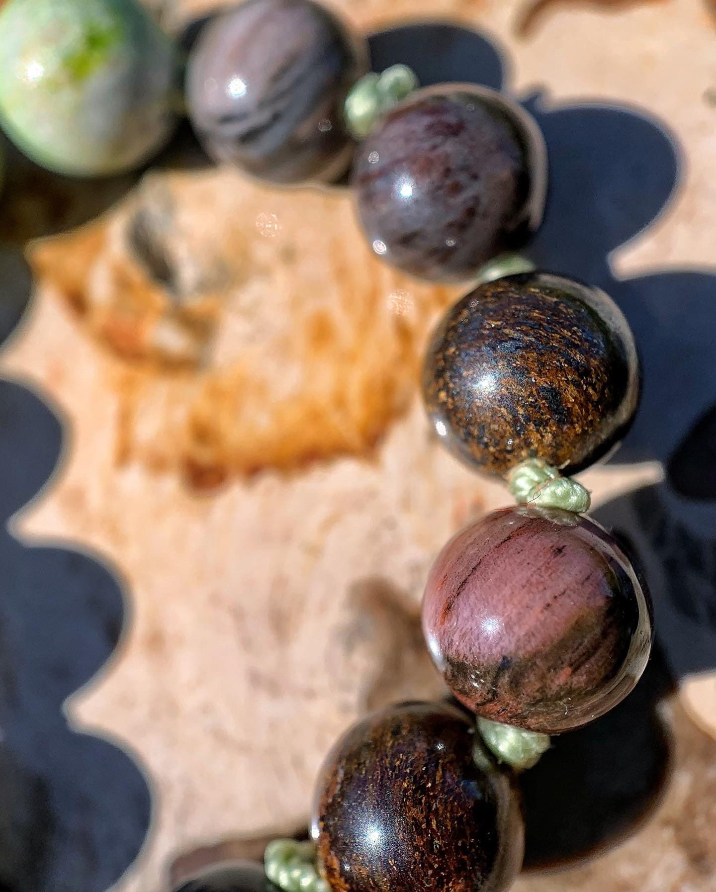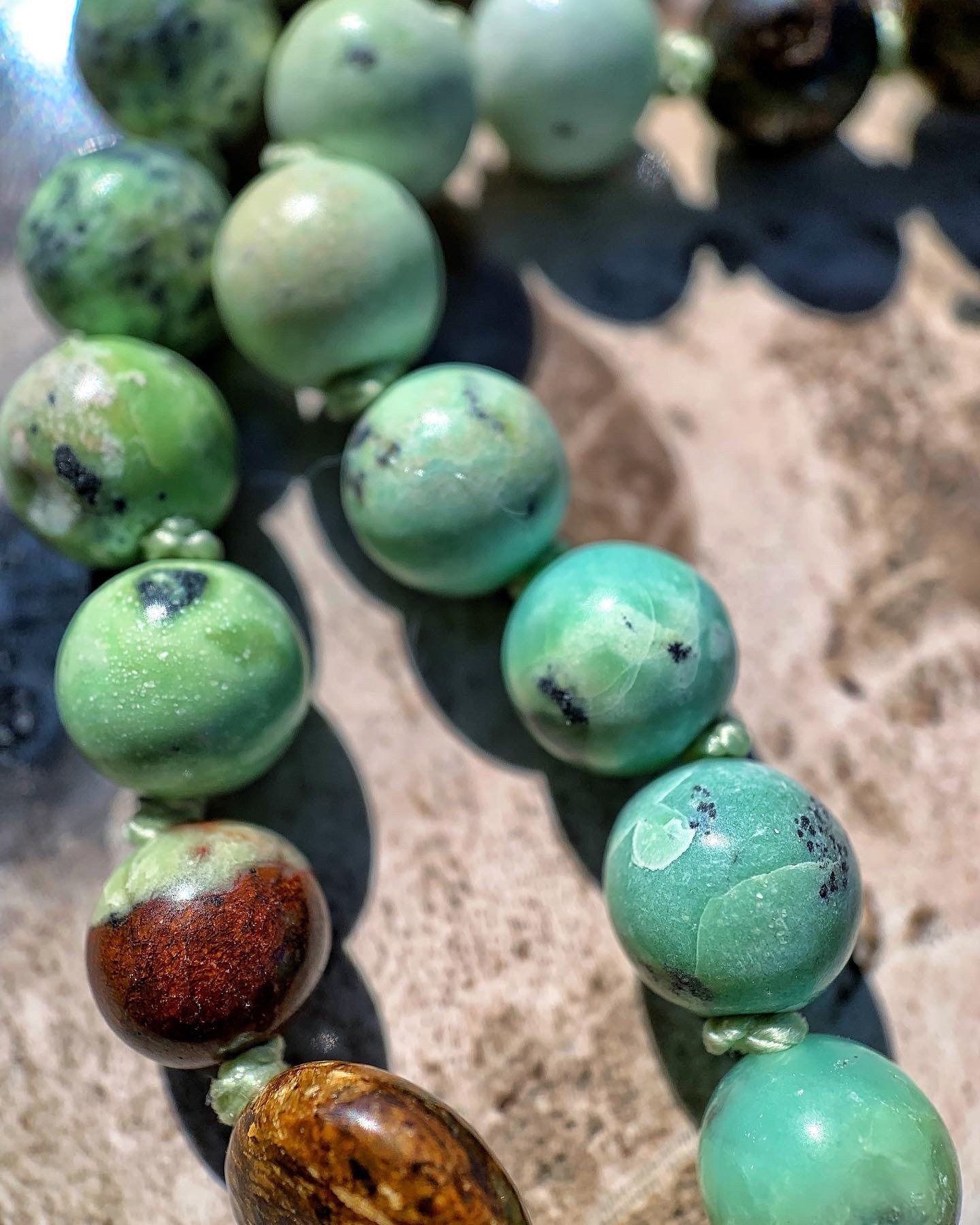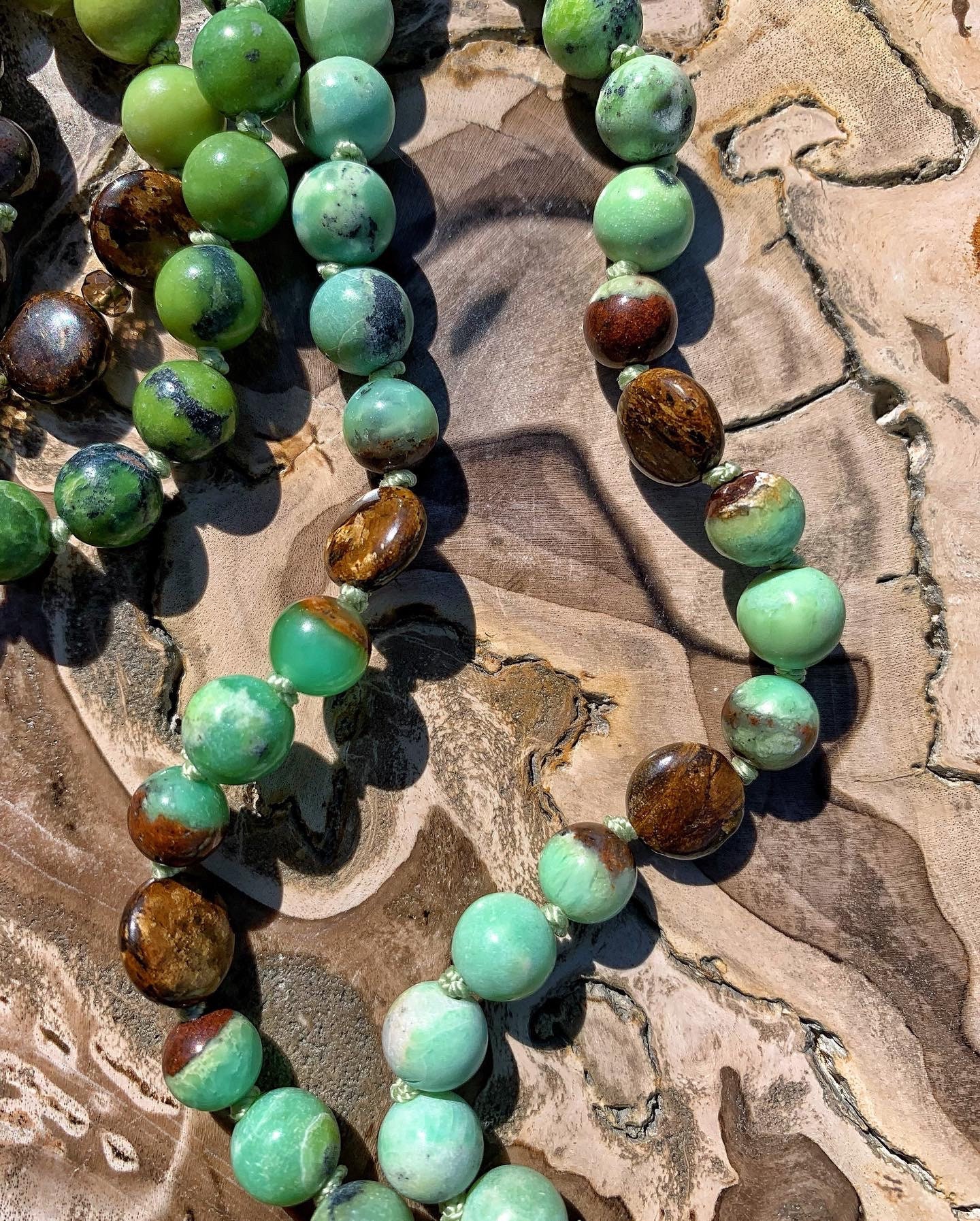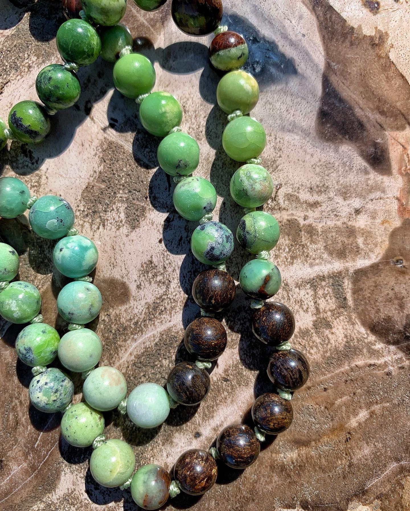 108 Top Quality Gemstone beads, Crystals and Stones in this necklace/bracelet are; Chrysoprase, Bronzite, Merlinite, Dendritic Agate, Smokey Quartz, Petrified Wood, Petrified Bog, Chalcedony and Opalized Nature. Finished with an electroplated 24k Gold Chrysoprase Pendant, 14k Gold Filled Beads and Black Spinel.
