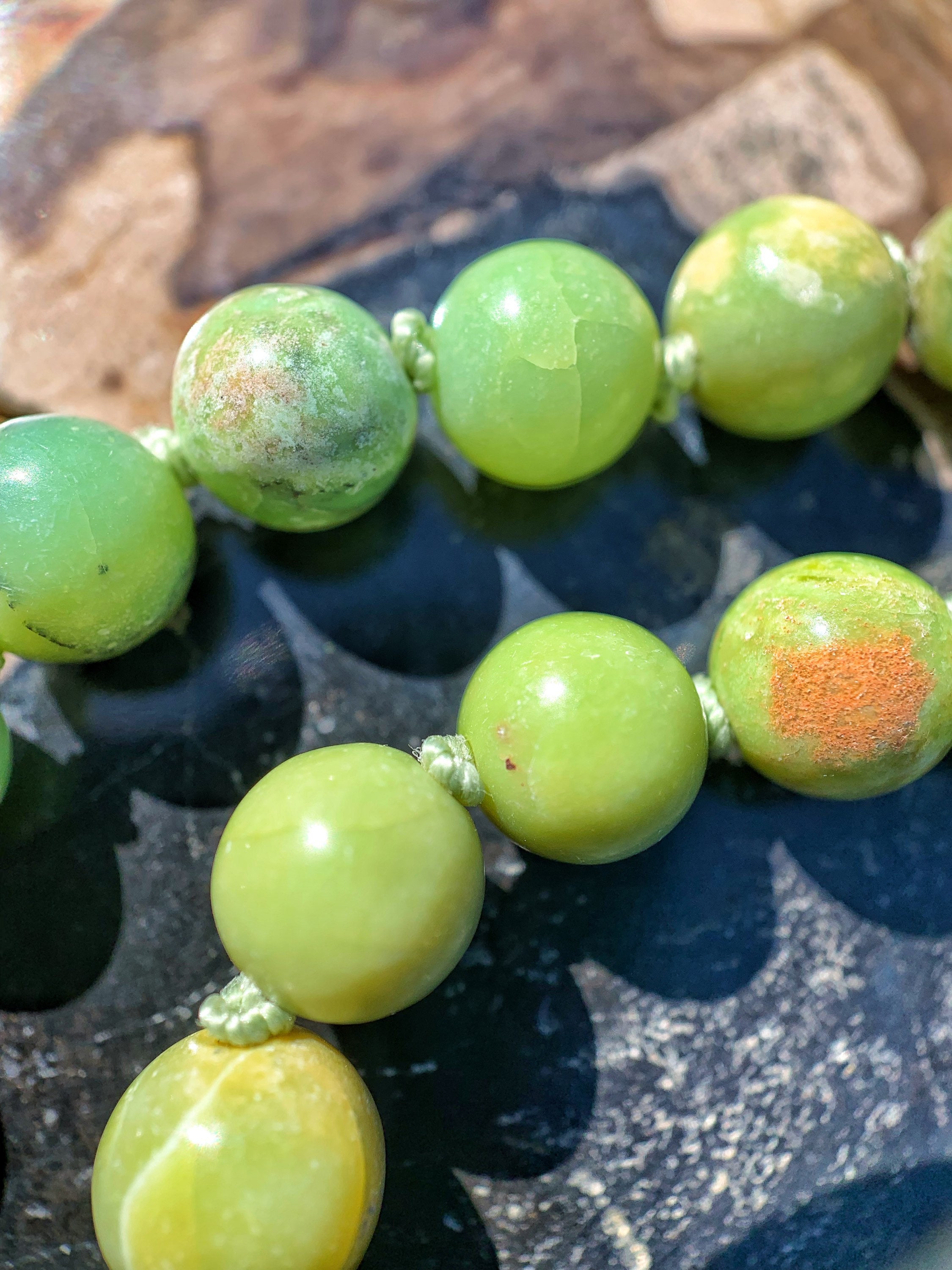 Overtime, depending on usage, the thread may break. Don't worry! The prayer knots will keep the mala intact, so you may lose one or two stones where the string broke - the rest will remain together. I am happy to cleanse, freshen, energetically charge and re-knot your prayer mala. This makes this item a life-time investment, for your journey.