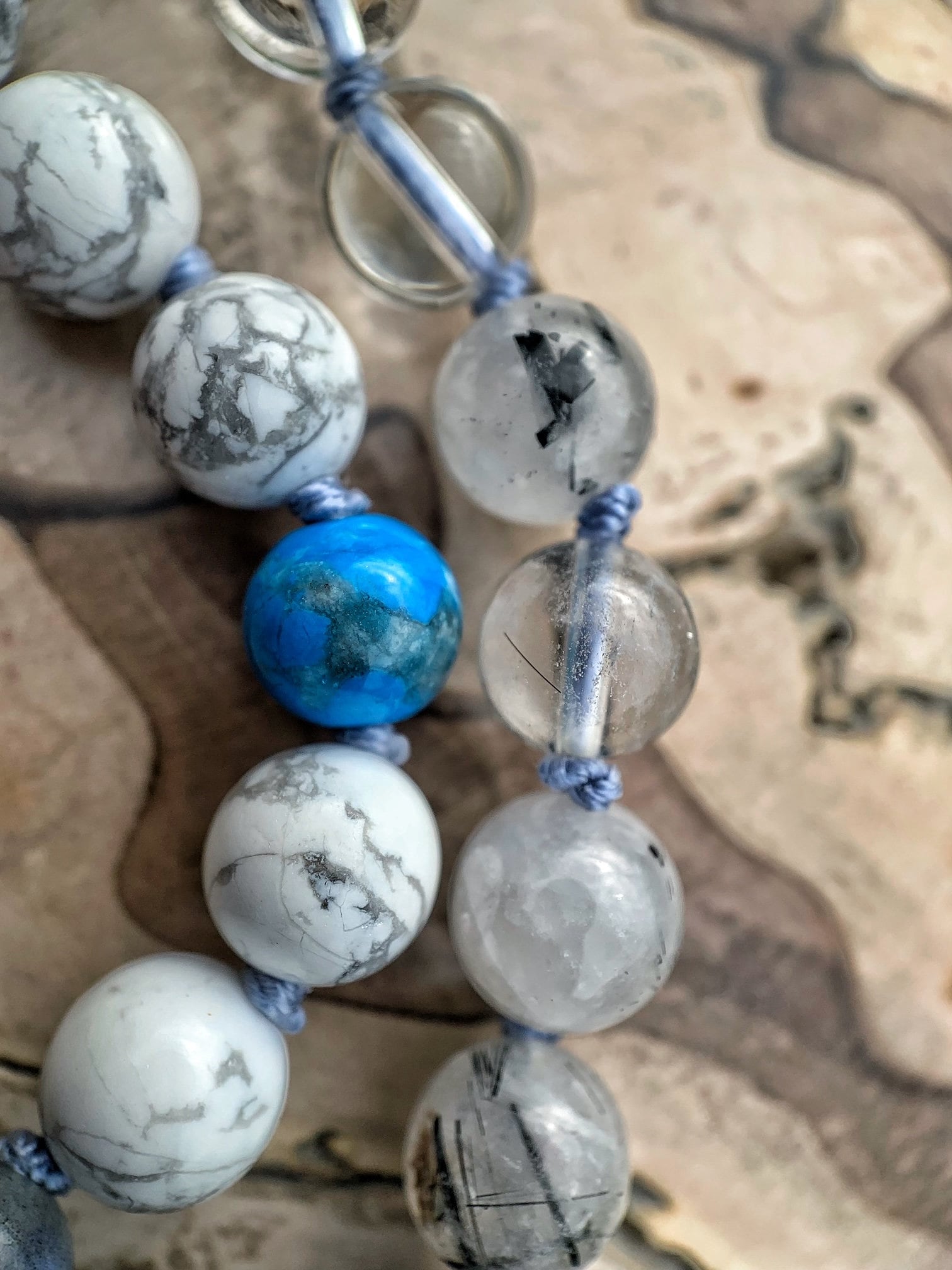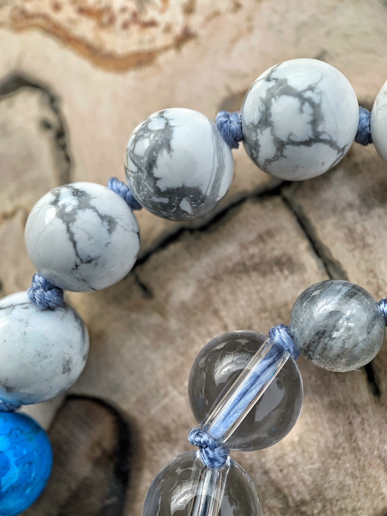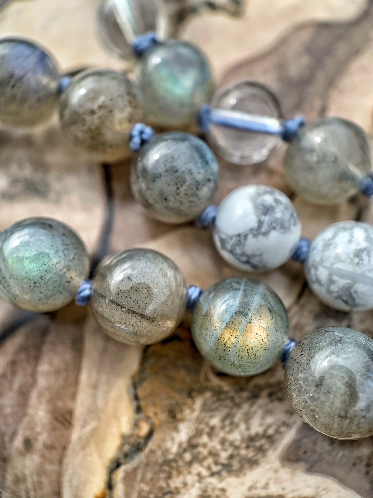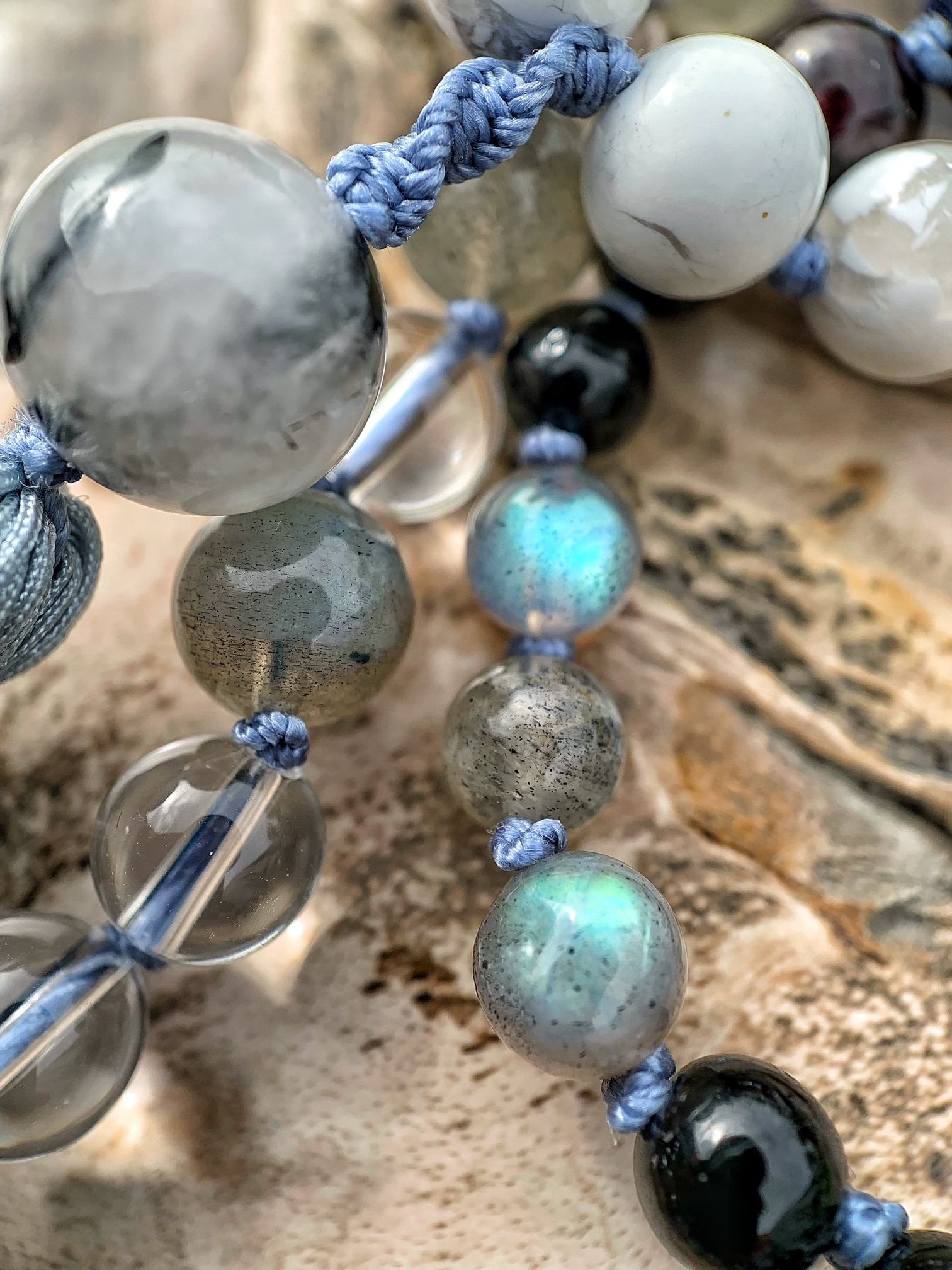 After playing with the Gems, Crystals and Stones I was inspired to create "The Storm Series" ... a three Mala series that portrays the colors and power in a stormy sky. All my inspiration comes from mother earth and my spiritual journey. The concept and manifestation coming directly from nature and symbolism of the mind. The mind is like the open blue sky and emotions are the stormy clouds that come and go.