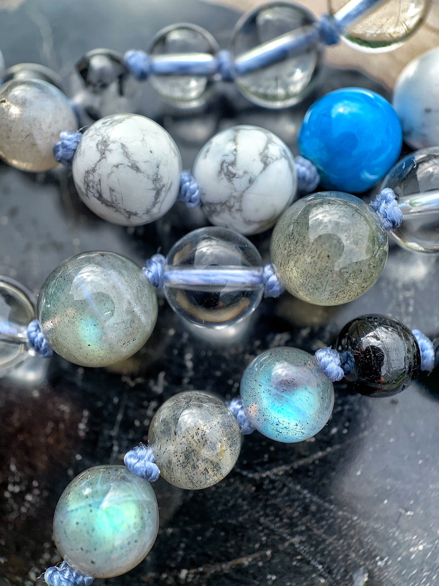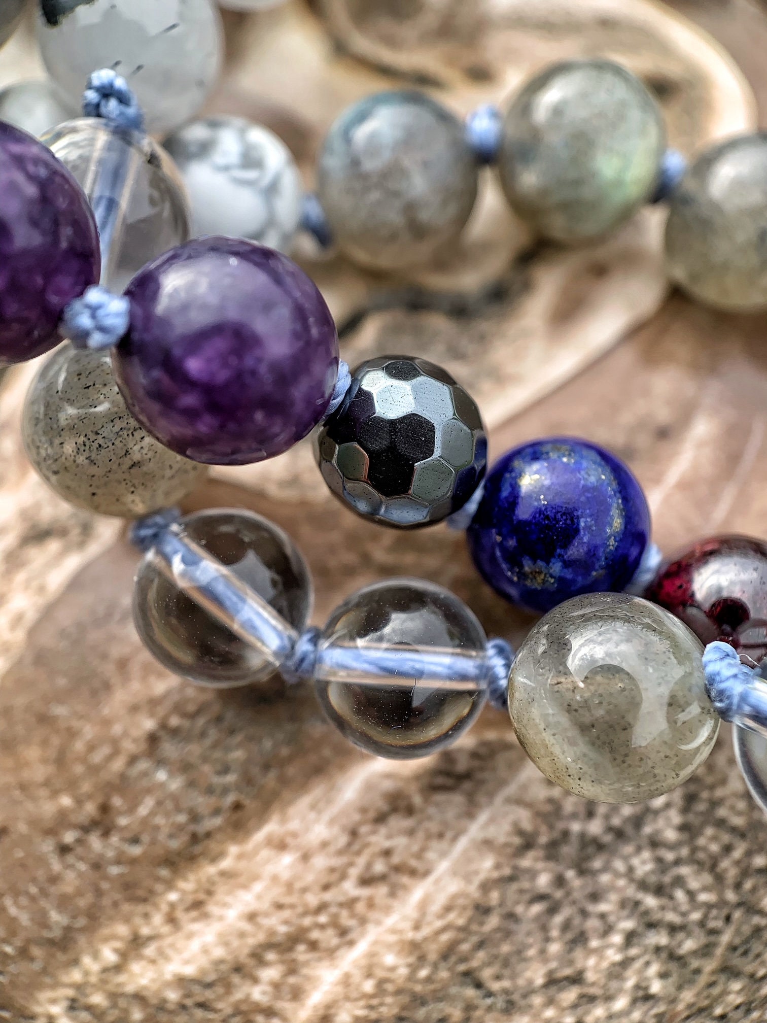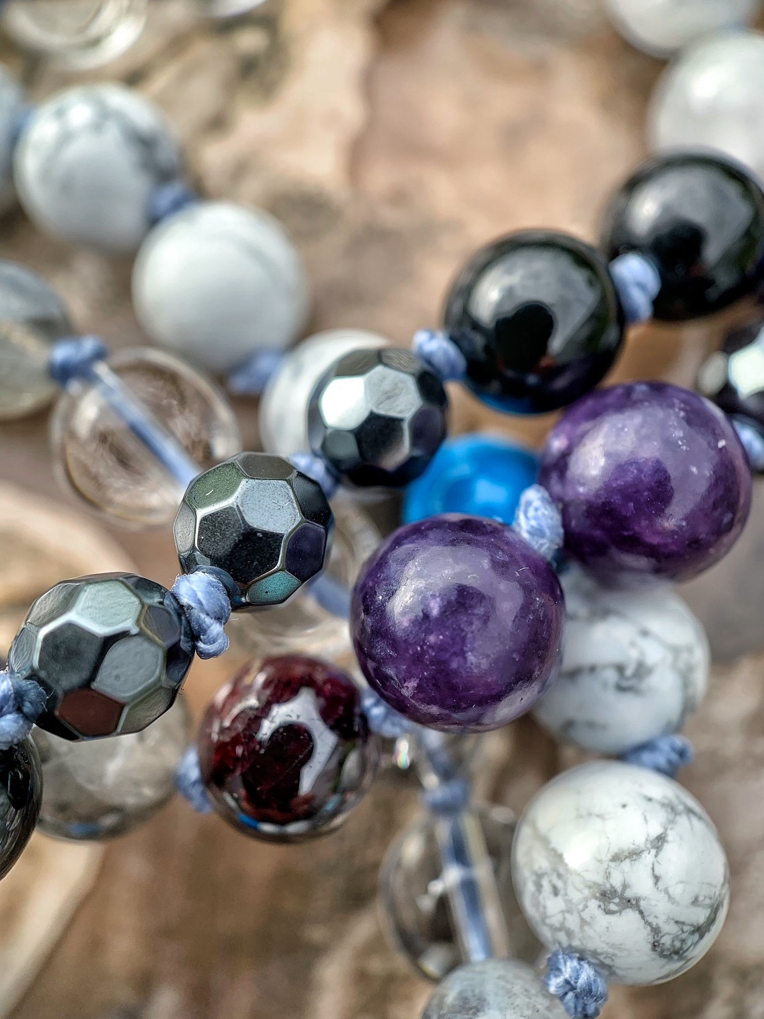 108 Top Quality Gemstone beads, Crystals and Stones in this necklace/bracelet are; Howlite, Dyed Blue Howlite, Hematite, Labradorite, Garnet, Black Tourmaline, Clear Quartz, Lapis Lazuli with Pyrite Inclusions, Tourmalinated Quartz, Lepidolite plus one Tourmalinated Quartz Guru Bead.