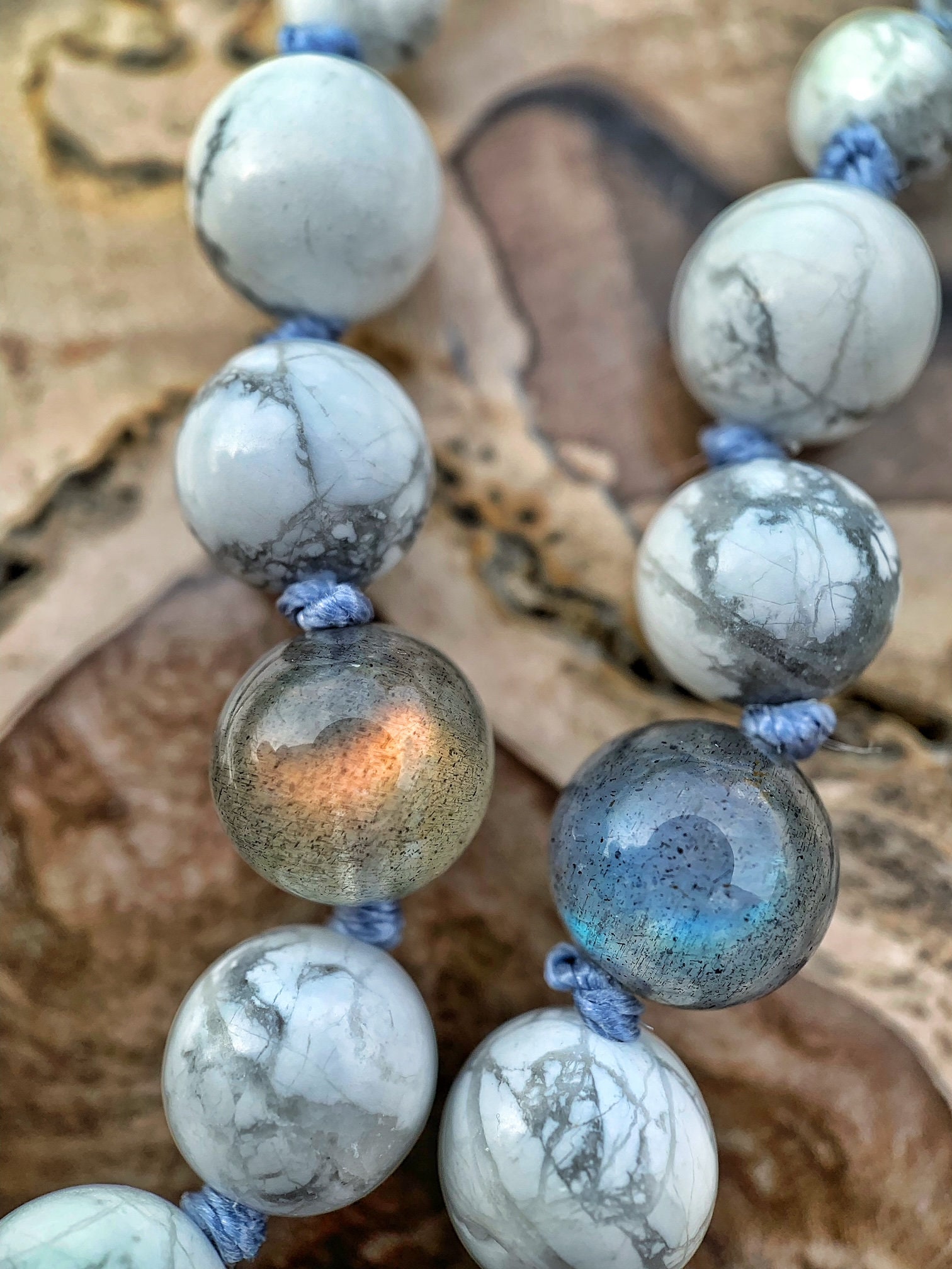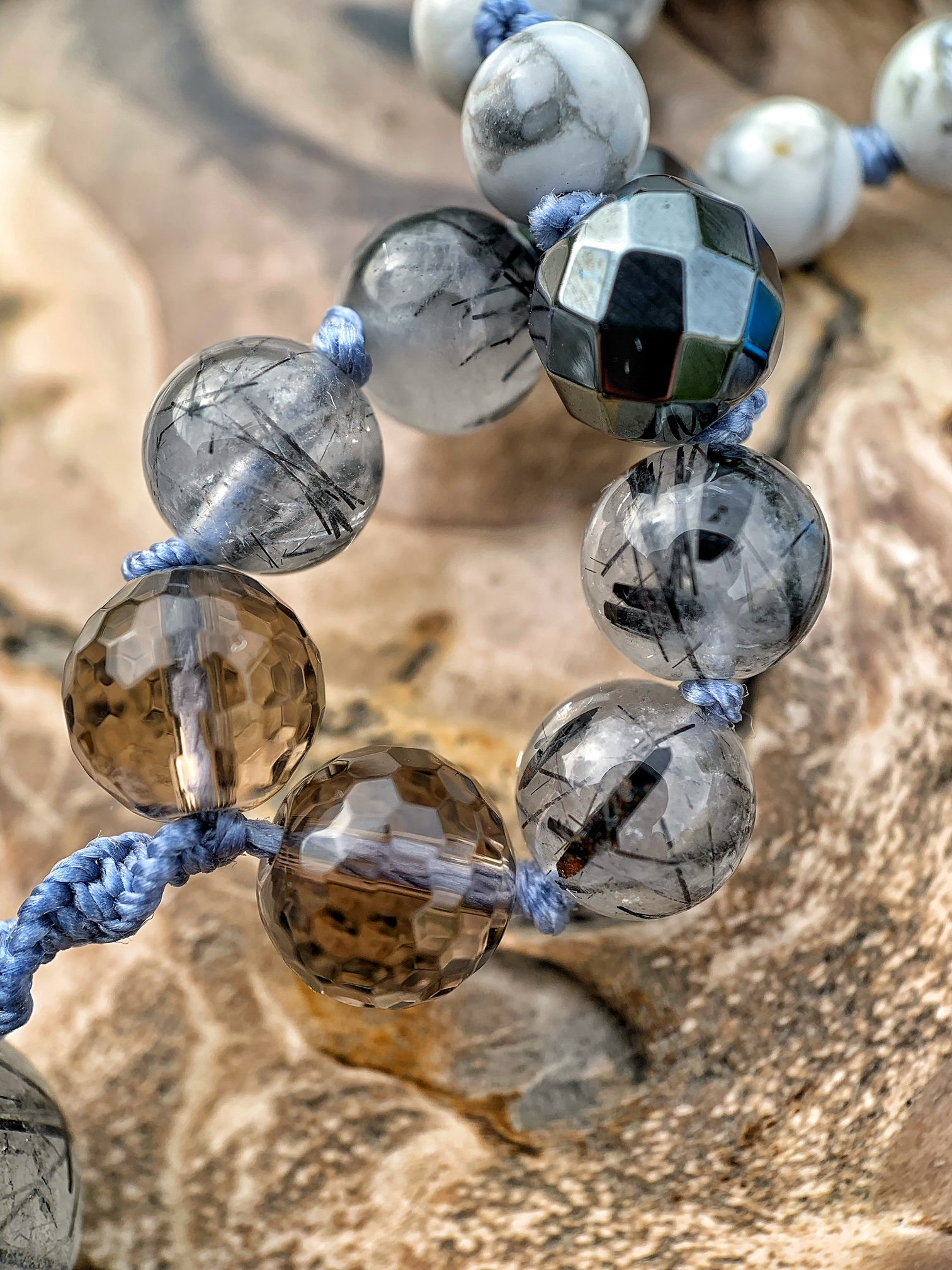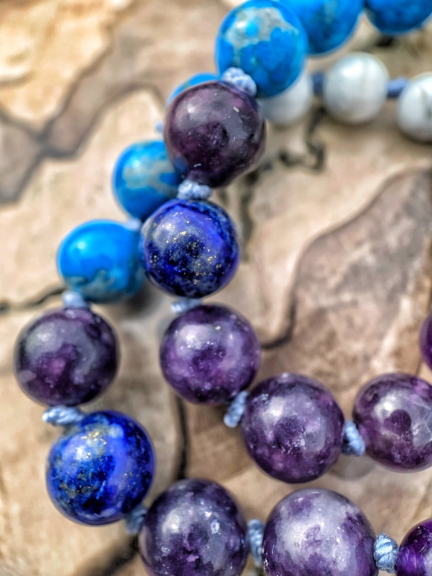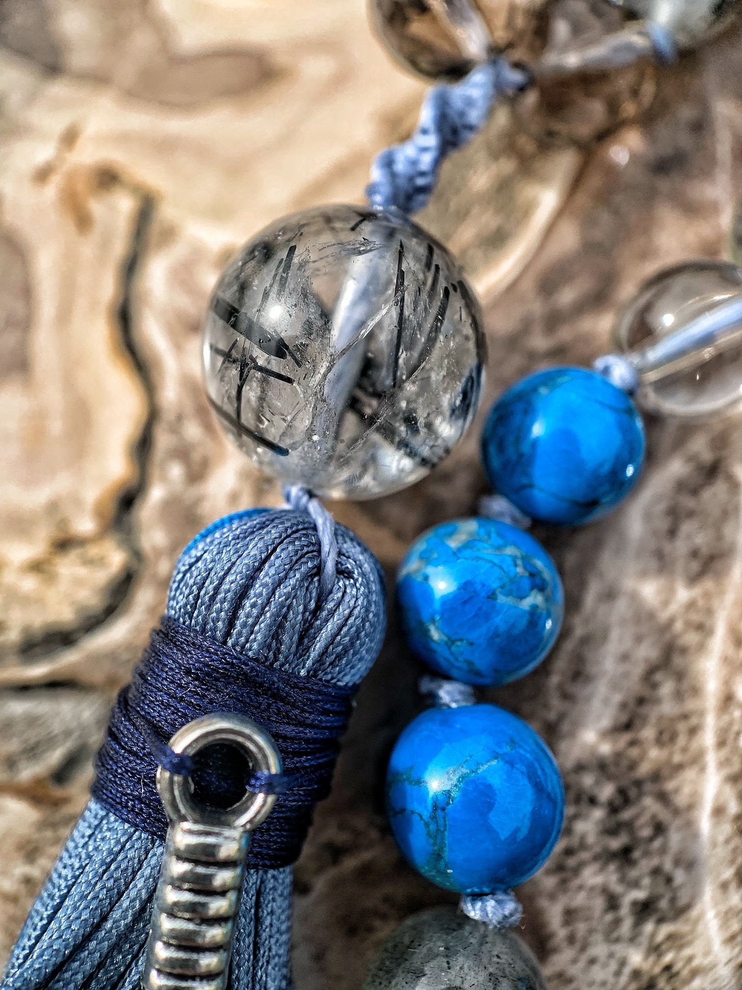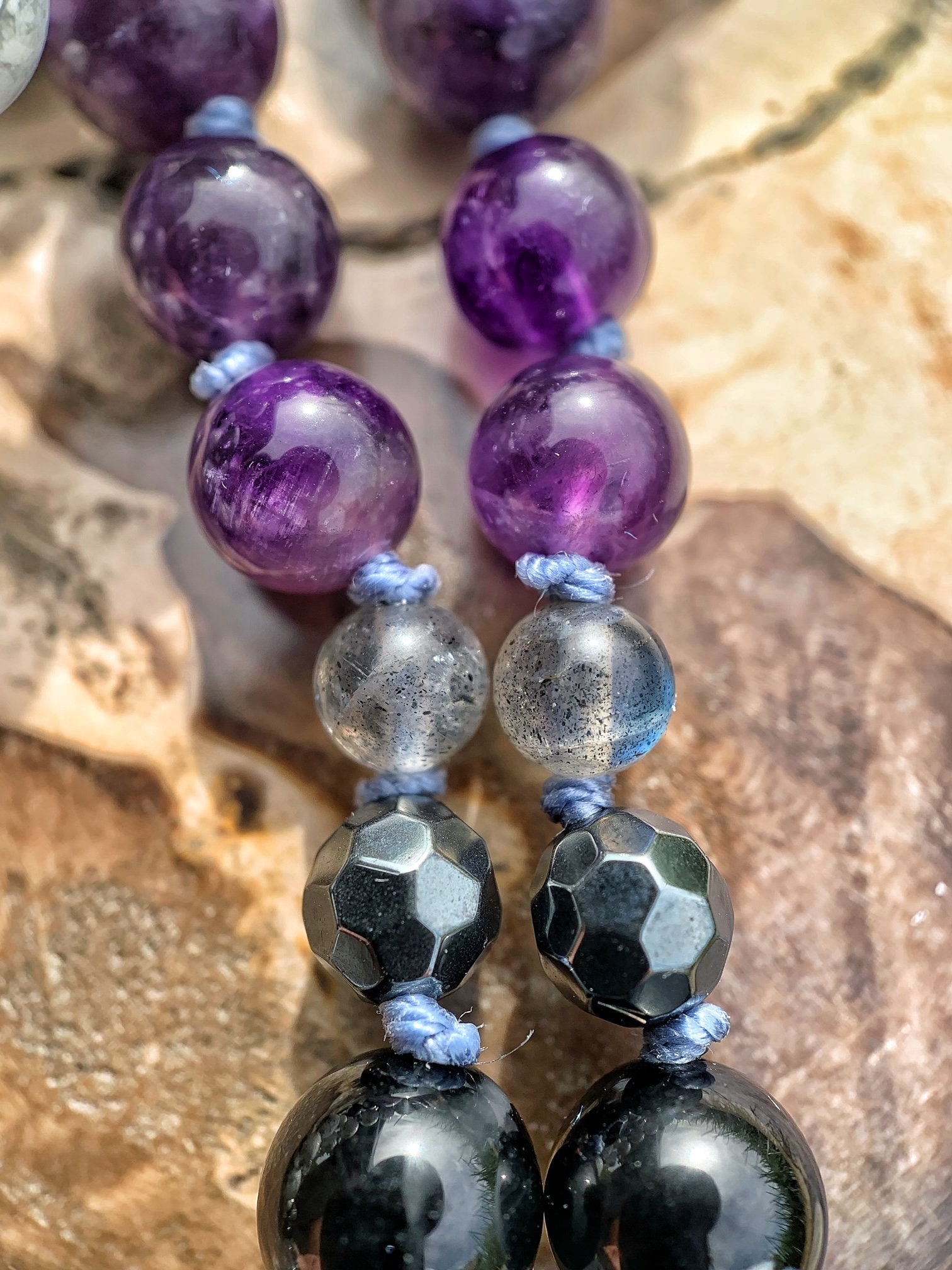 108 Top Quality Gemstone beads, Crystals and Stones in this necklace/bracelet are; Howlite, Dyed Blue Howlite, Hematite, Labradorite, Garnet, Black Tourmaline, Clear Quartz, Lapis Lazuli with Pyrite Inclusions, Amethyst, Tourmalinated Quartz, Lepidolite plus one Tourmalinated Quartz Guru Bead.
