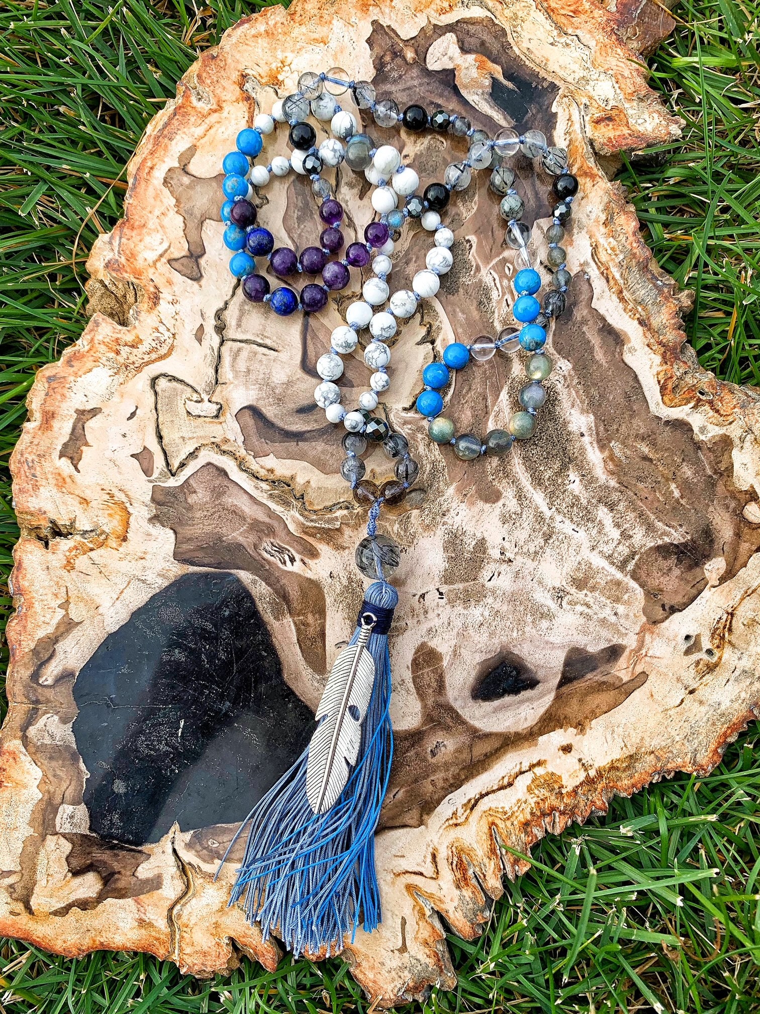 The Prayer Mala can be worn as a necklace or wrapped around the wrist as a bracelet. All Gems, Crystals and Stones are cleansed energetically, blessed and carefully hand selected and knotted for each Mala - no two are alike.