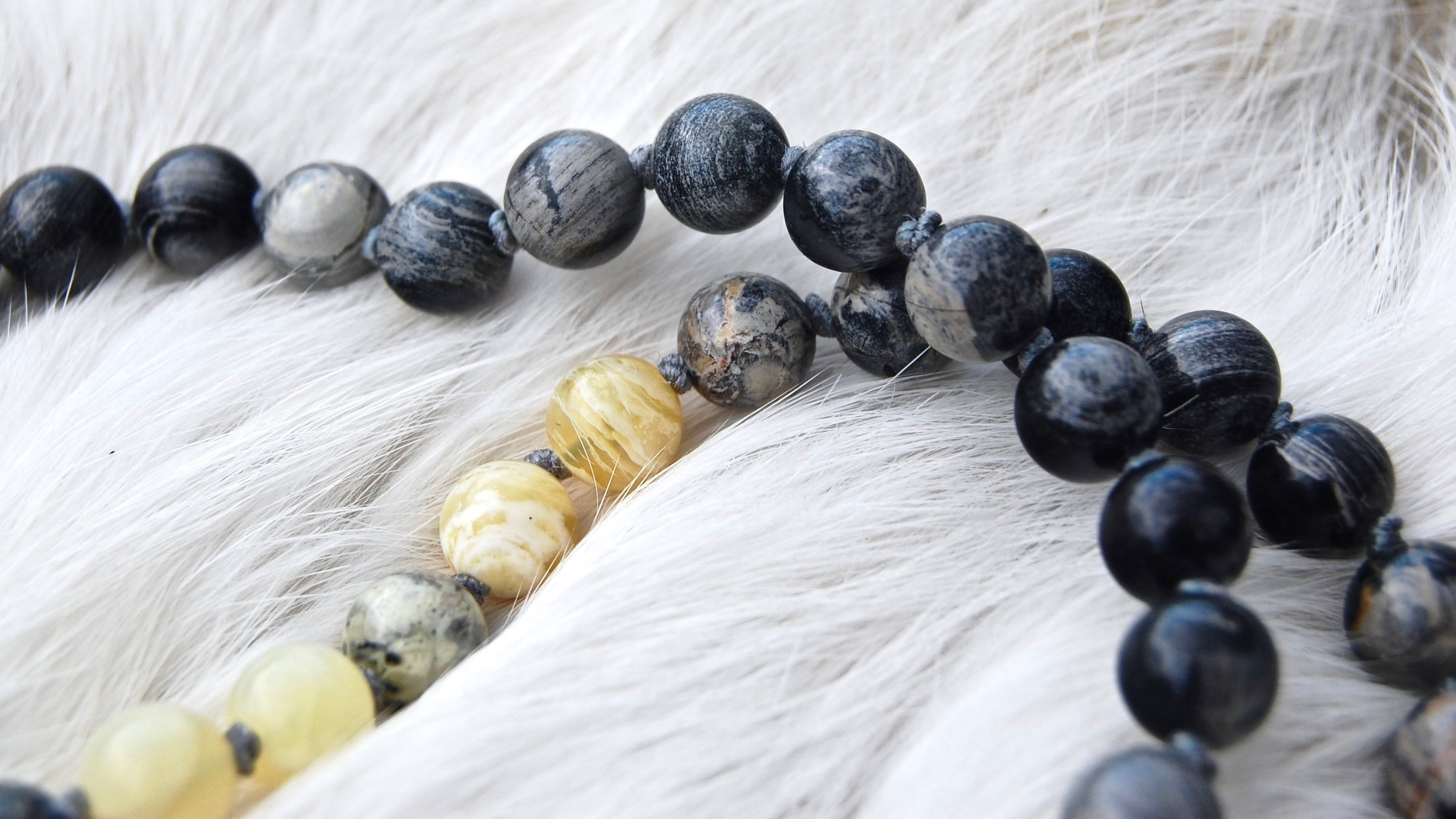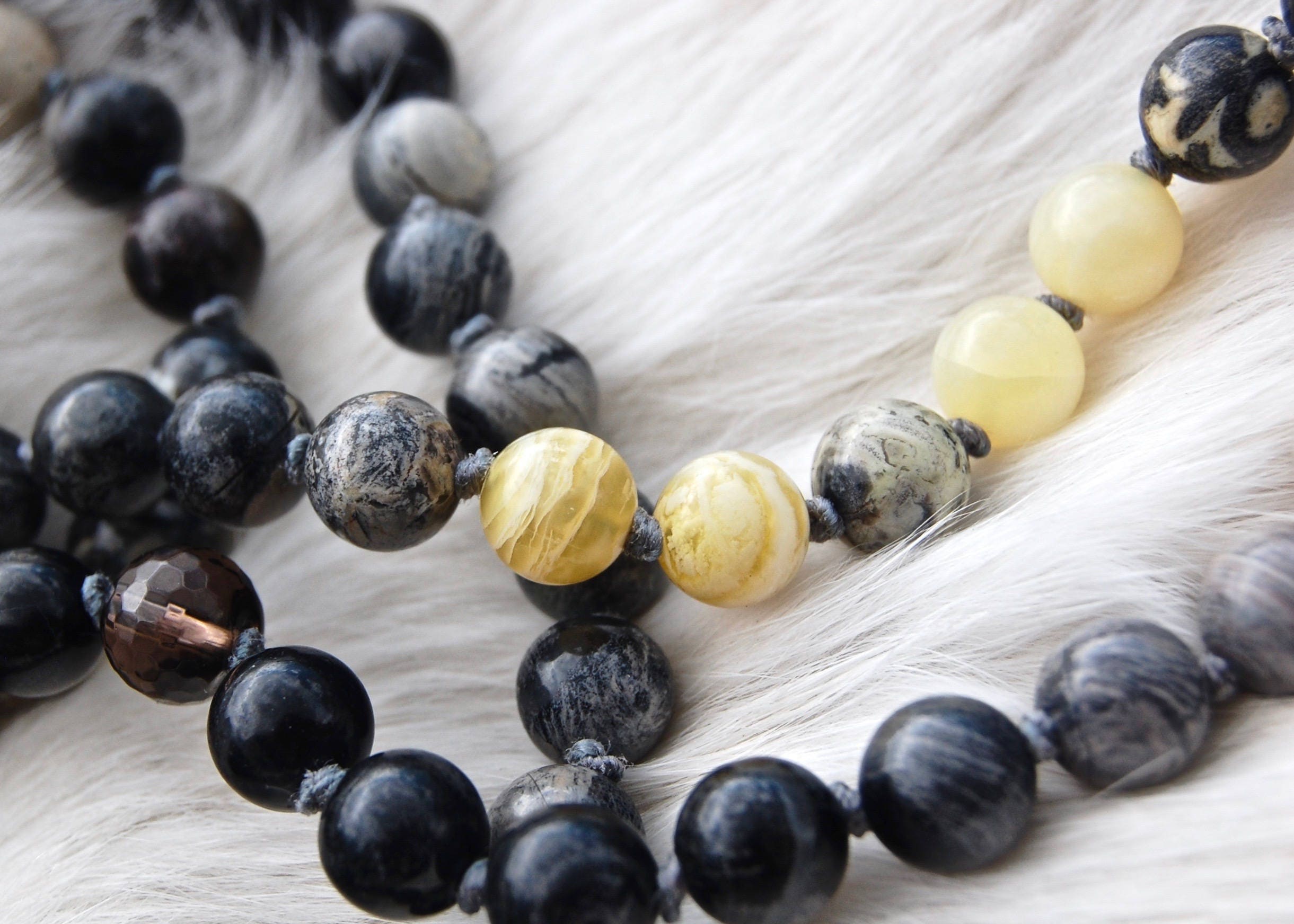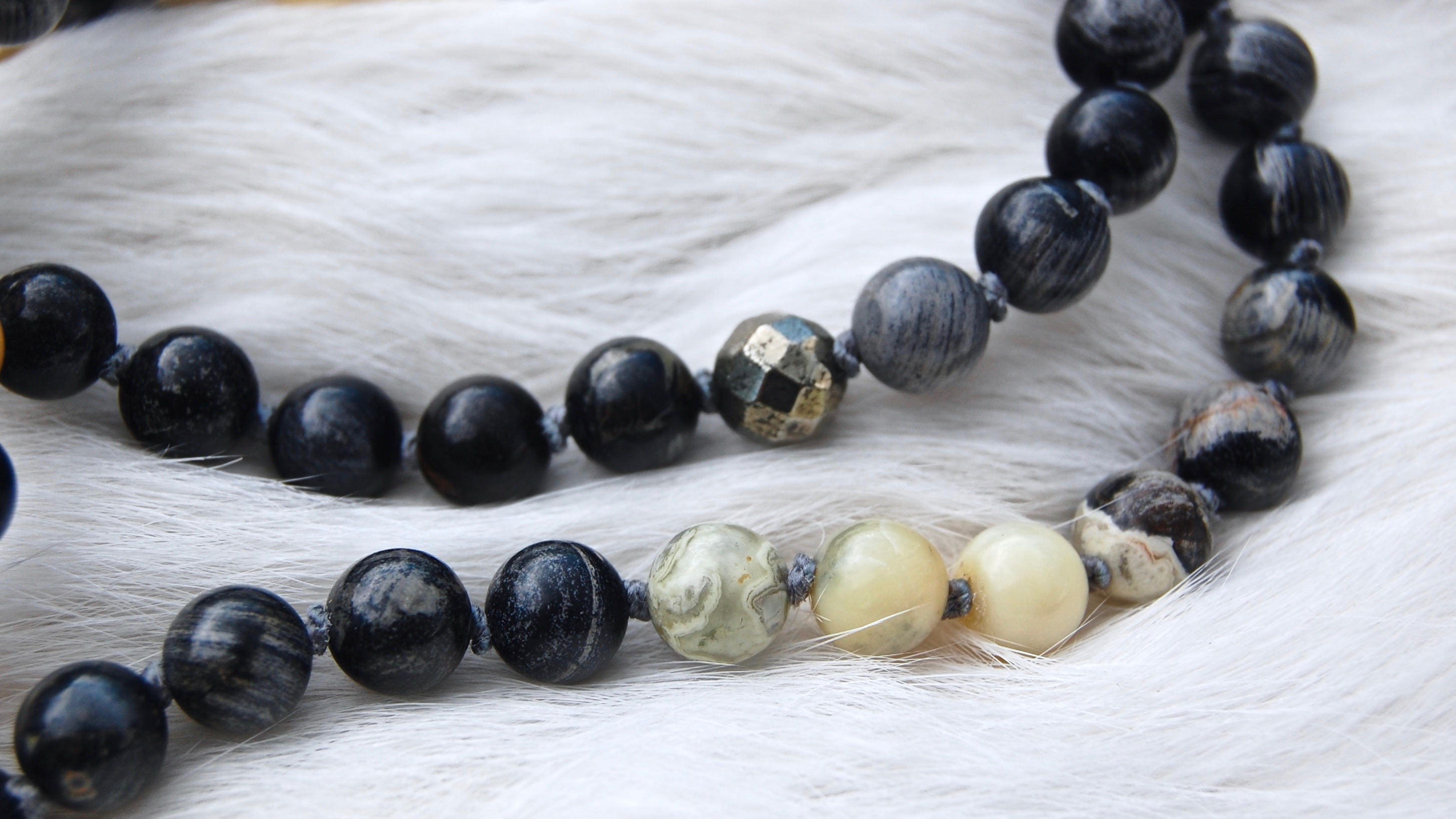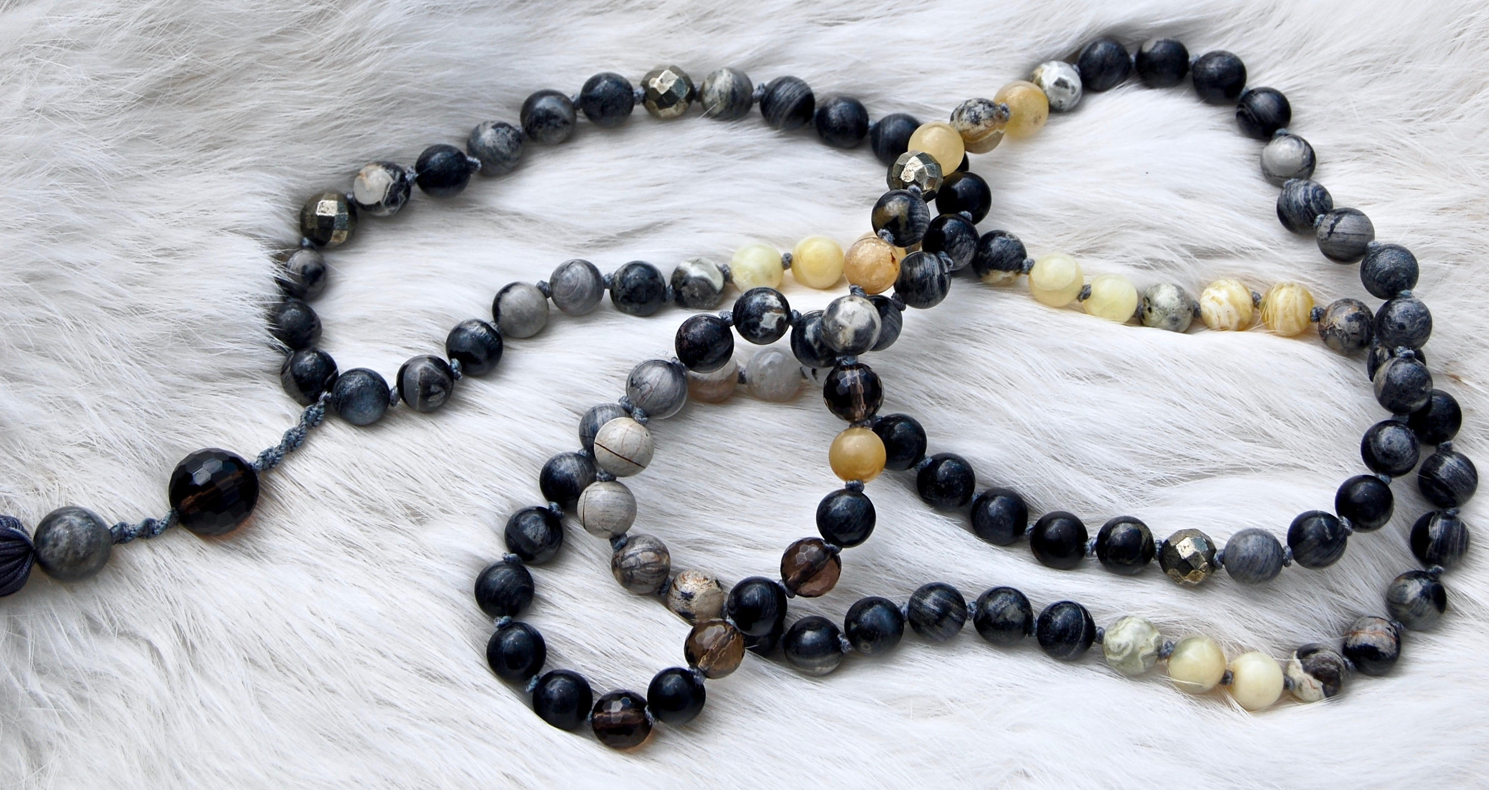 108 Gems, Crystals and Stones in this necklace/bracelet are; Silver Leaf Jasper, Honey Calcite, Honey Opal, Grey Moonstone, Labradorite and Smokey Quartz .