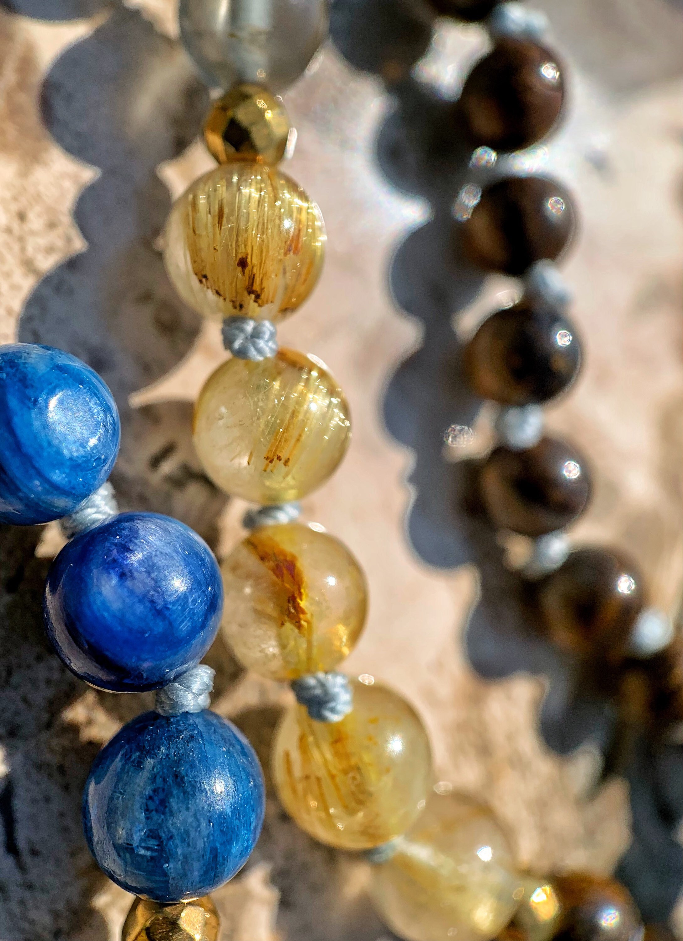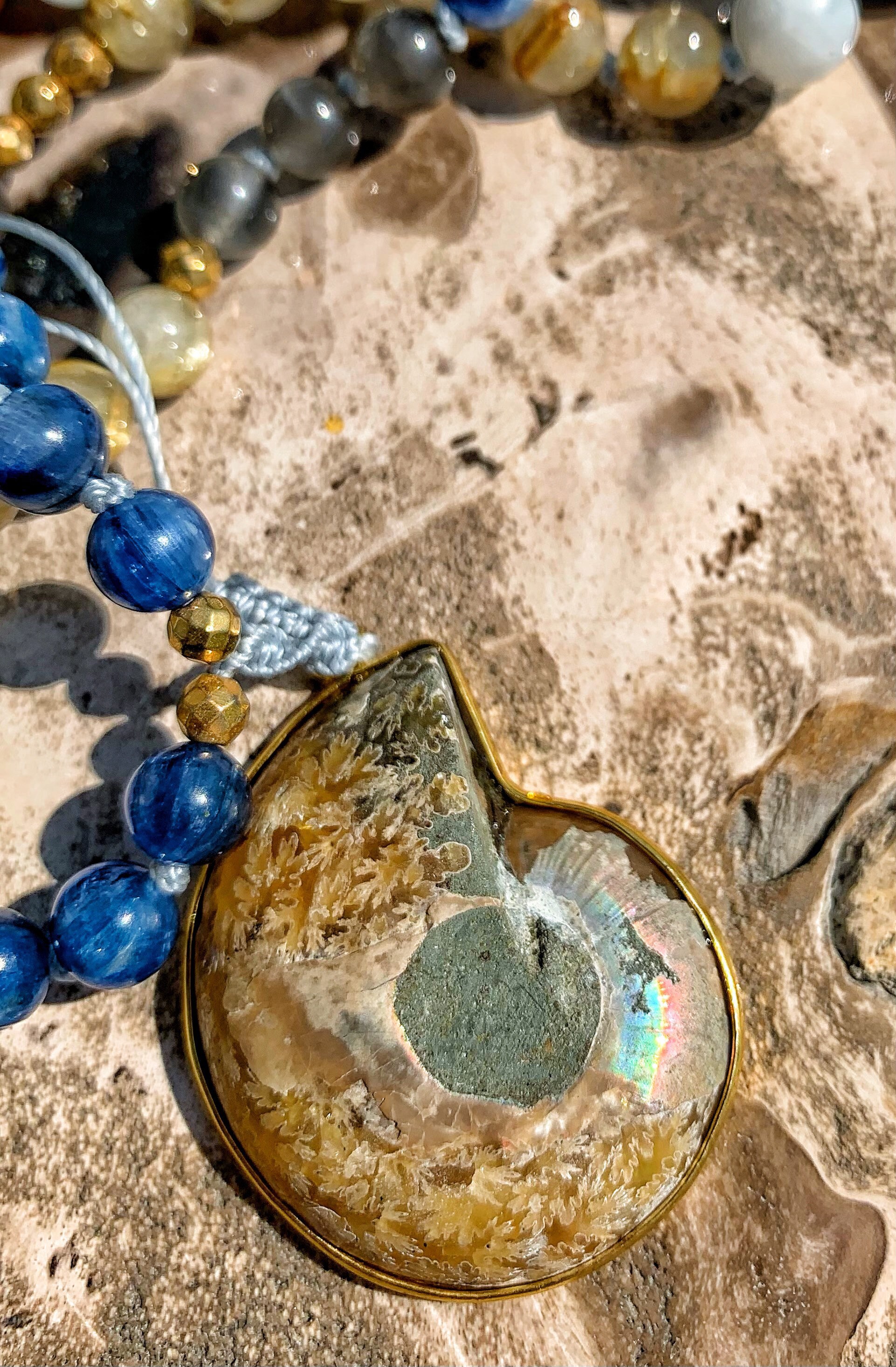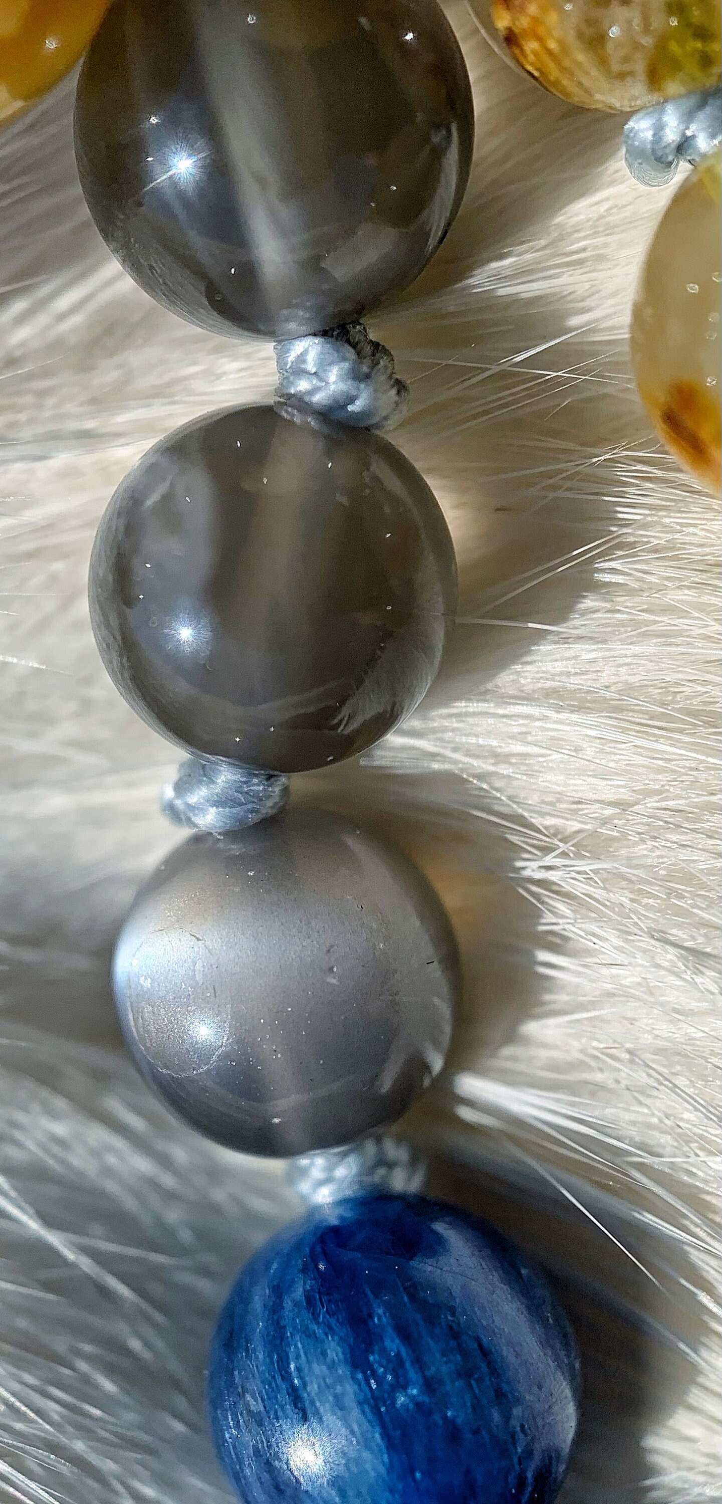 124 Quality Gemstone beads, Crystals and Stones in this necklace/bracelet are; White Moonstone, Grey Moonstone, Golden Tiger Eye, Blue Kyanite, 24k Gold Hematite, Bronzite, White Moonstone, Pietersite, Gold Rutile Quartz and one 22k gold plated Ammonite pendant.