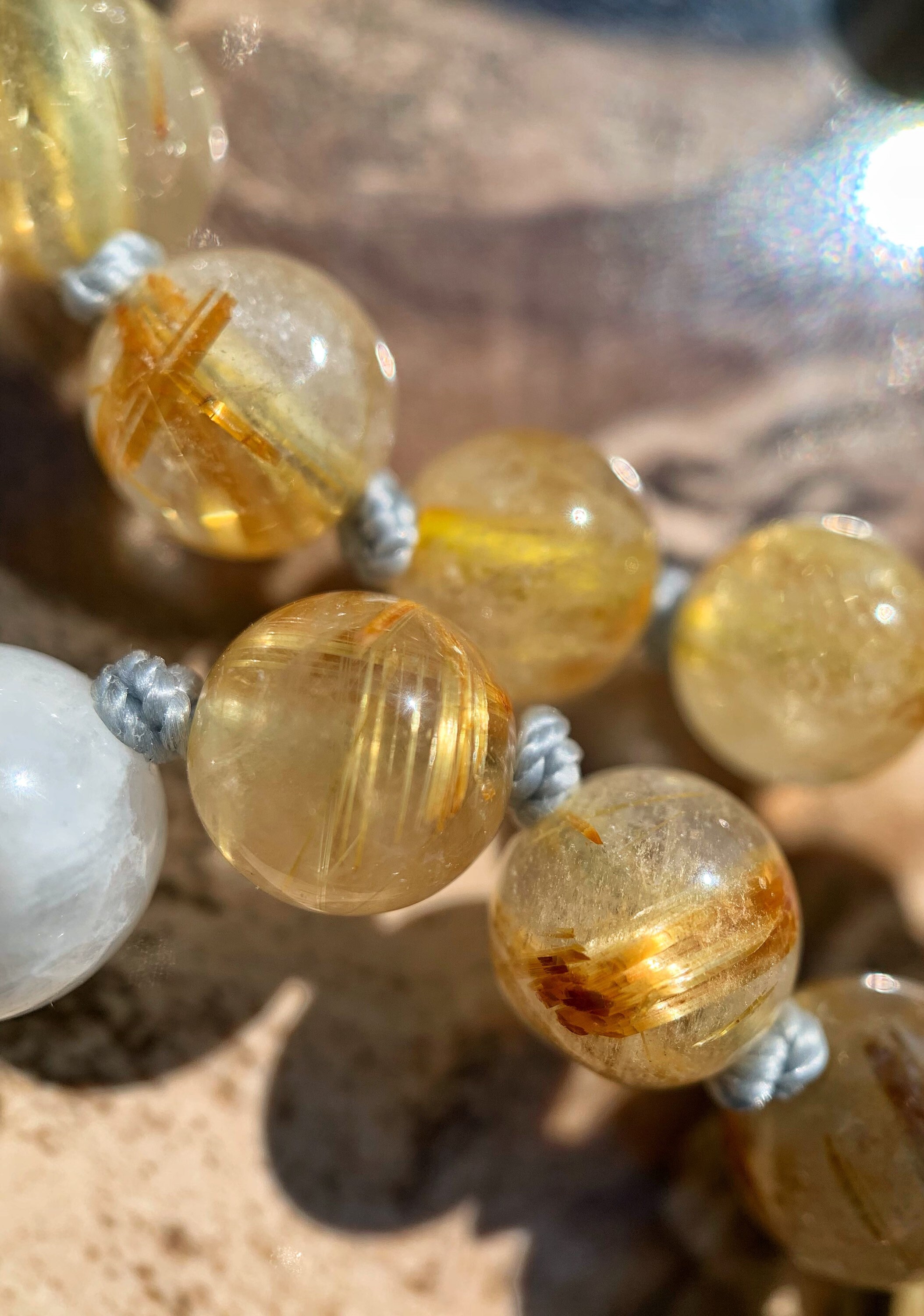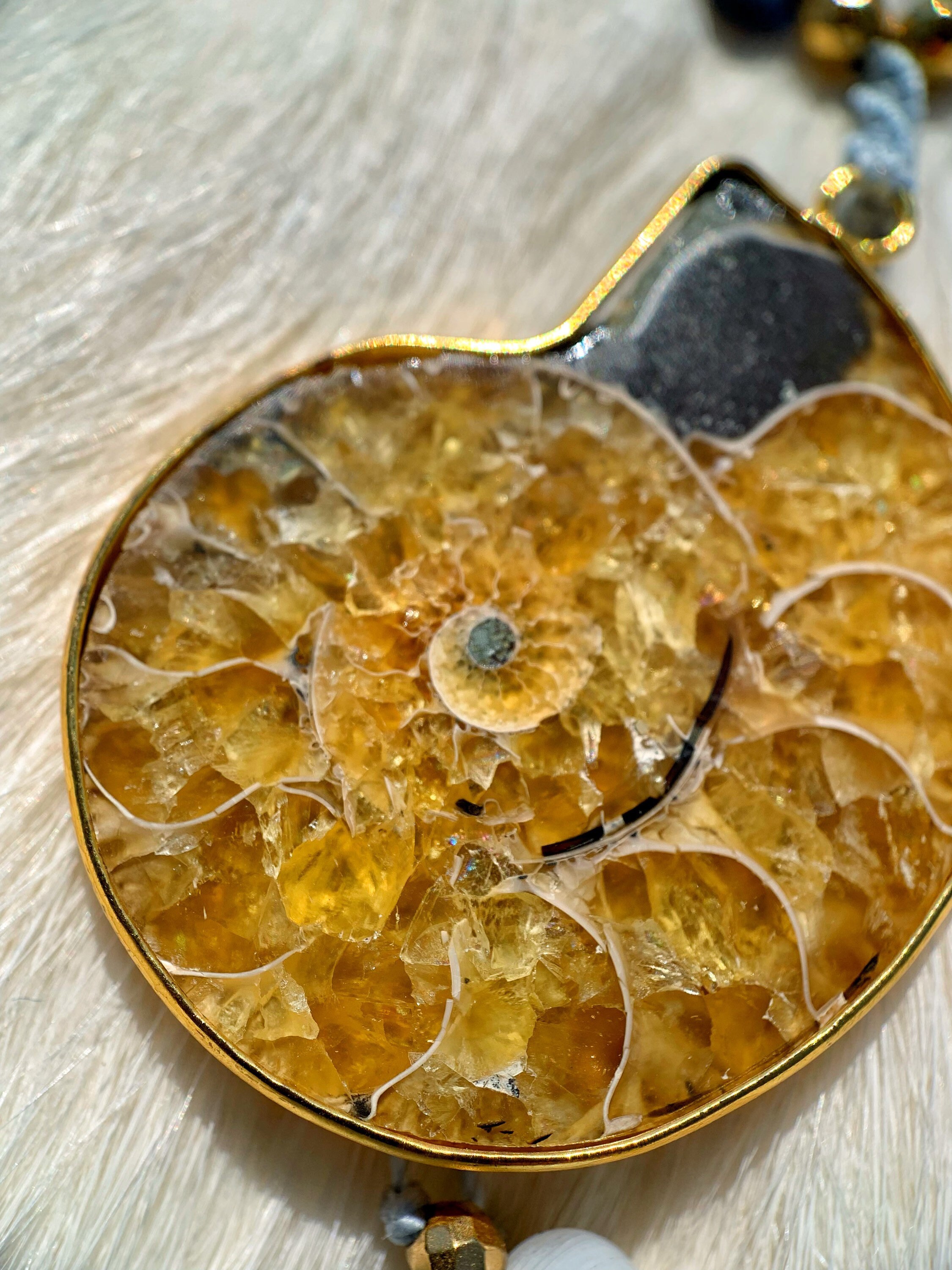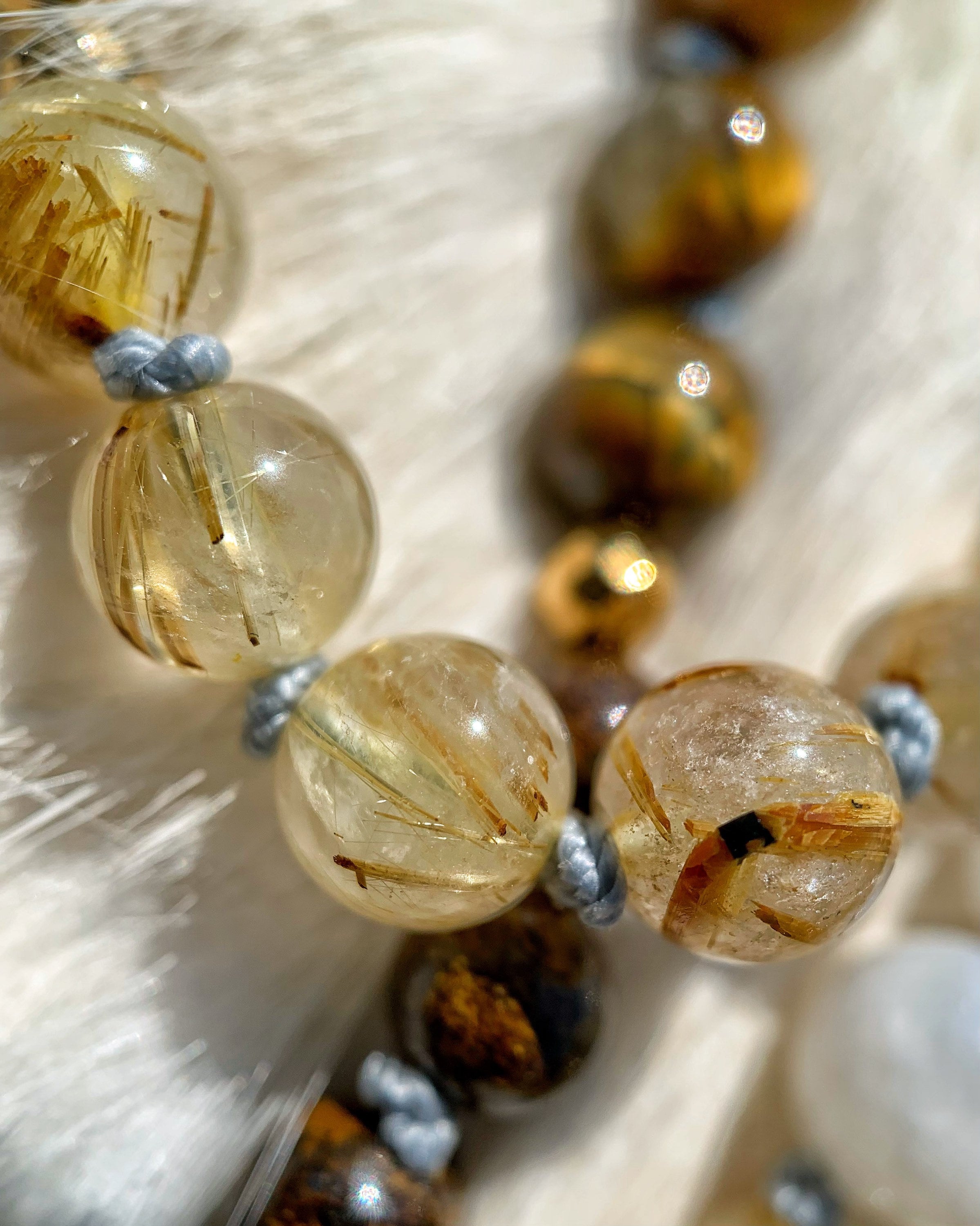 124 Quality Gemstone beads, Crystals and Stones in this necklace/bracelet are; White Moonstone, Grey Moonstone, Golden Tiger Eye, Blue Kyanite, 24k Gold Hematite, Bronzite, White Moonstone, Pietersite, Gold Rutile Quartz and one 22k gold plated Ammonite pendant.