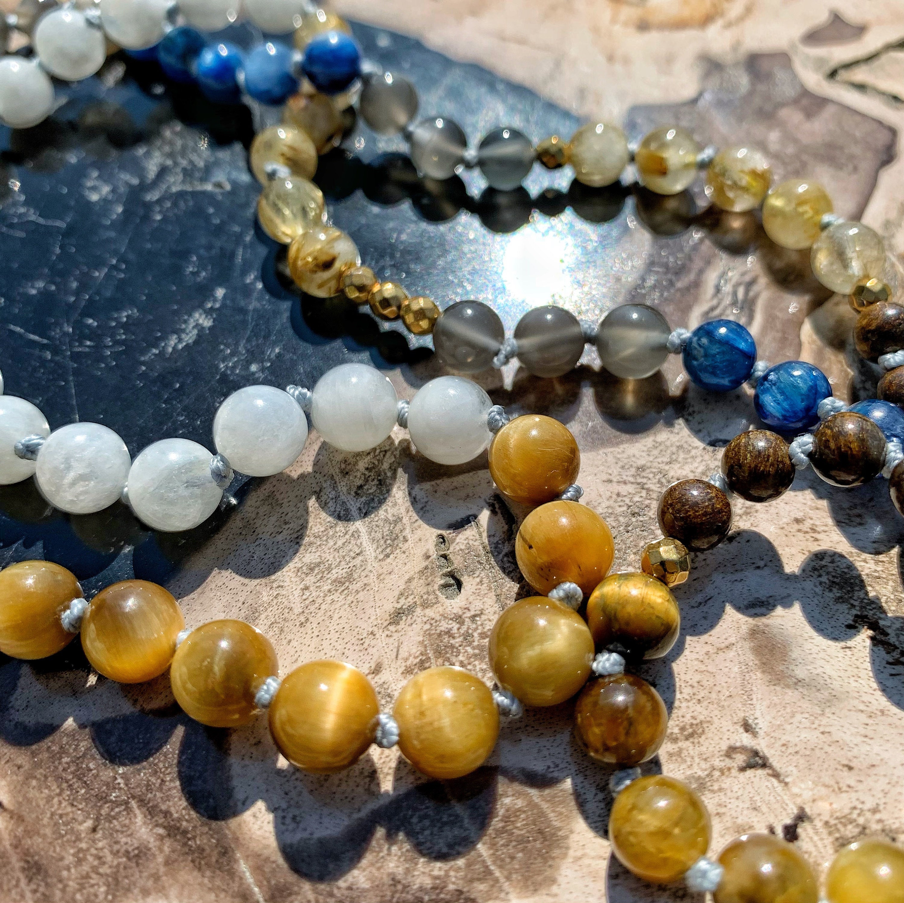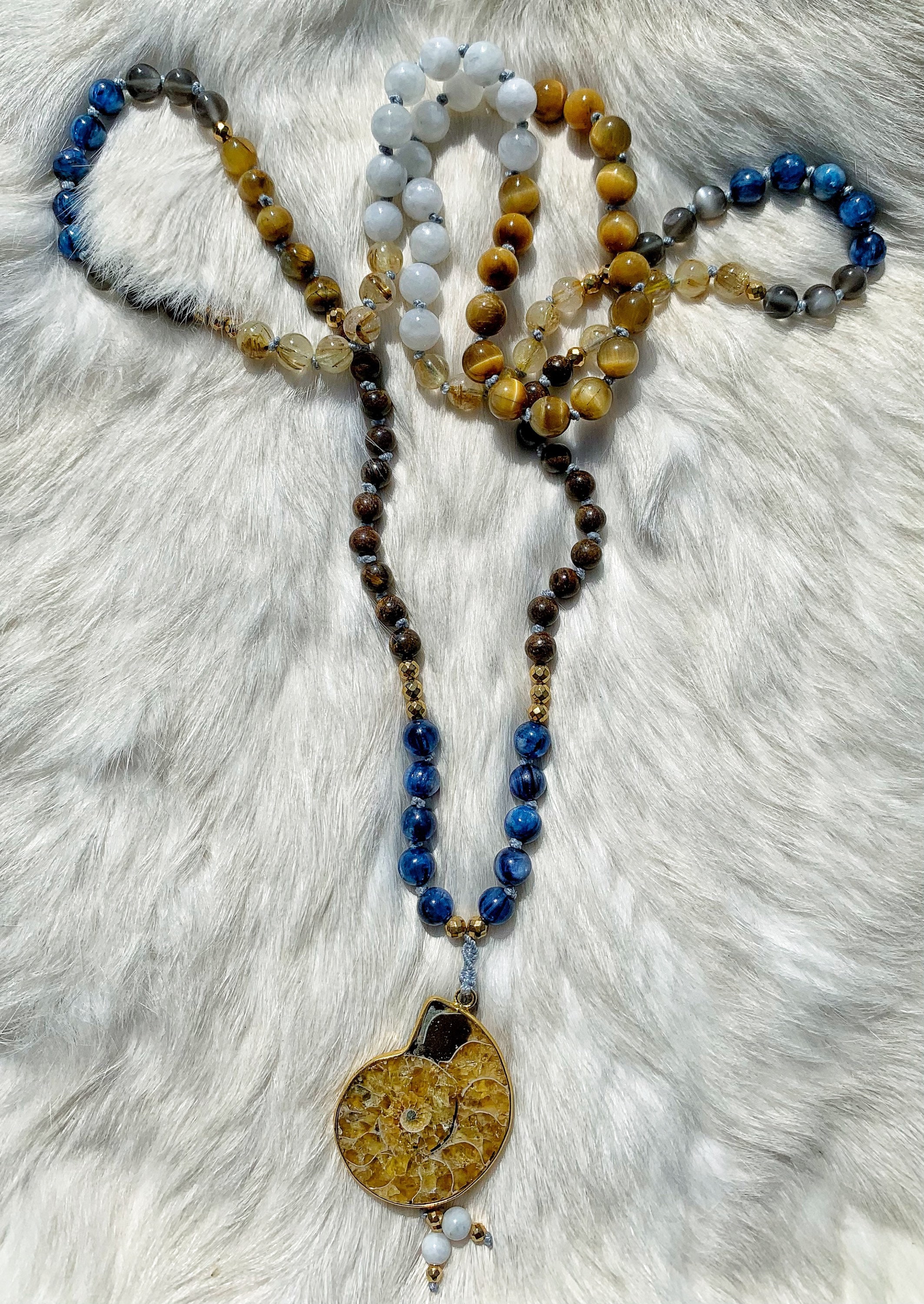 The Prayer Mala can be worn as a necklace or wrapped around the wrist as a bracelet. All Gems, Crystals and Stones are cleansed energetically, blessed and carefully hand selected and knotted for each Mala - no two are alike.
